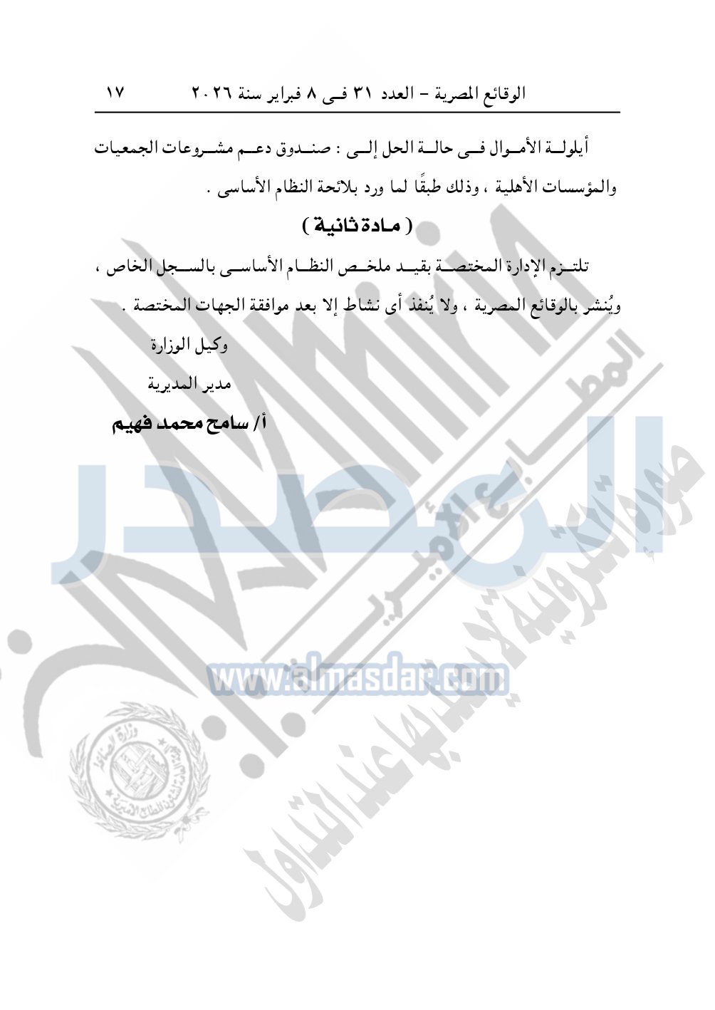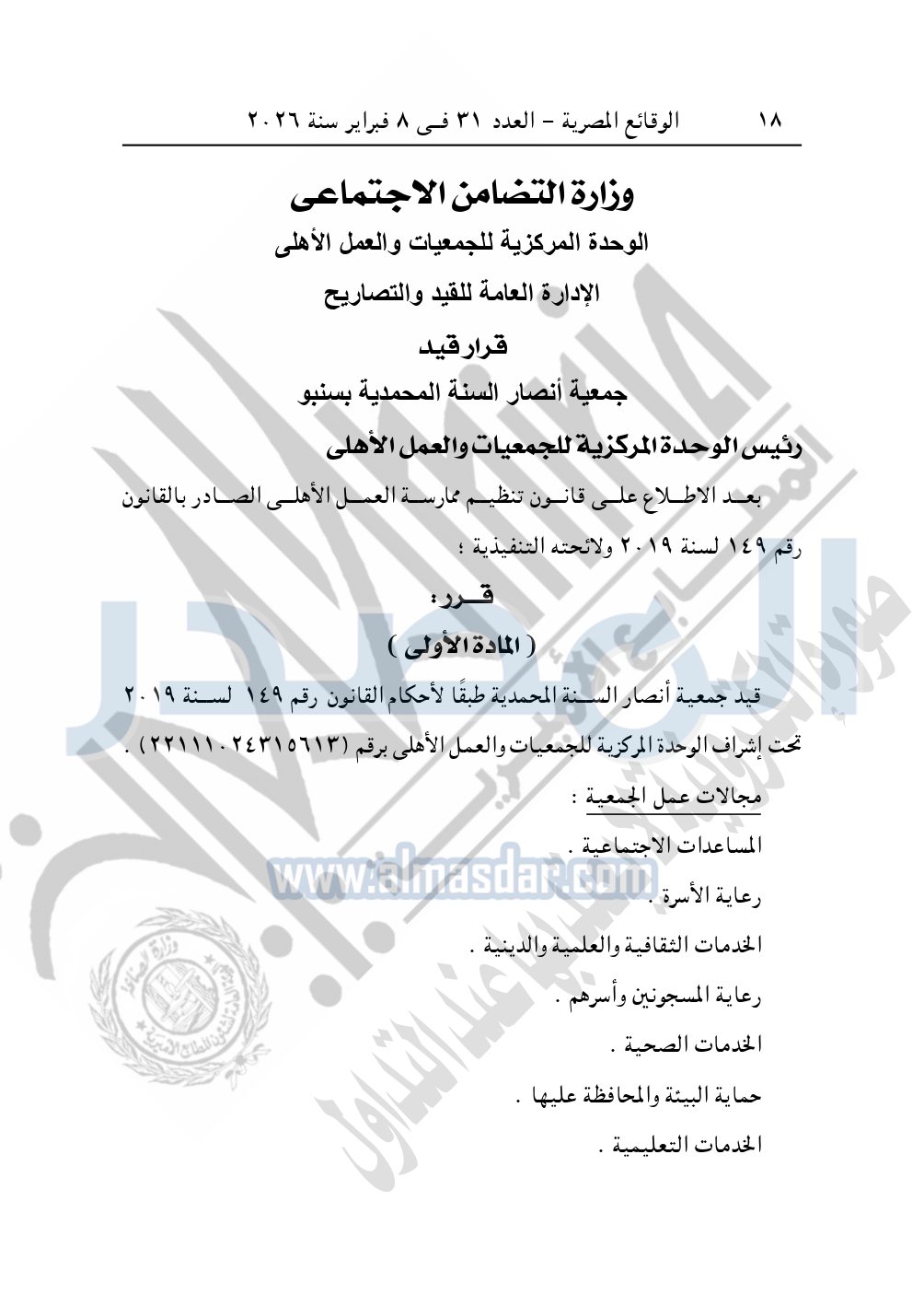 ونشرت الوقائع المصرية في العدد 31، الصادر في 8 فبراير 2026، قرار وزارة التضامن الاجتماعي، بشأن قيد جمعية أنصار السنة المحمدية.