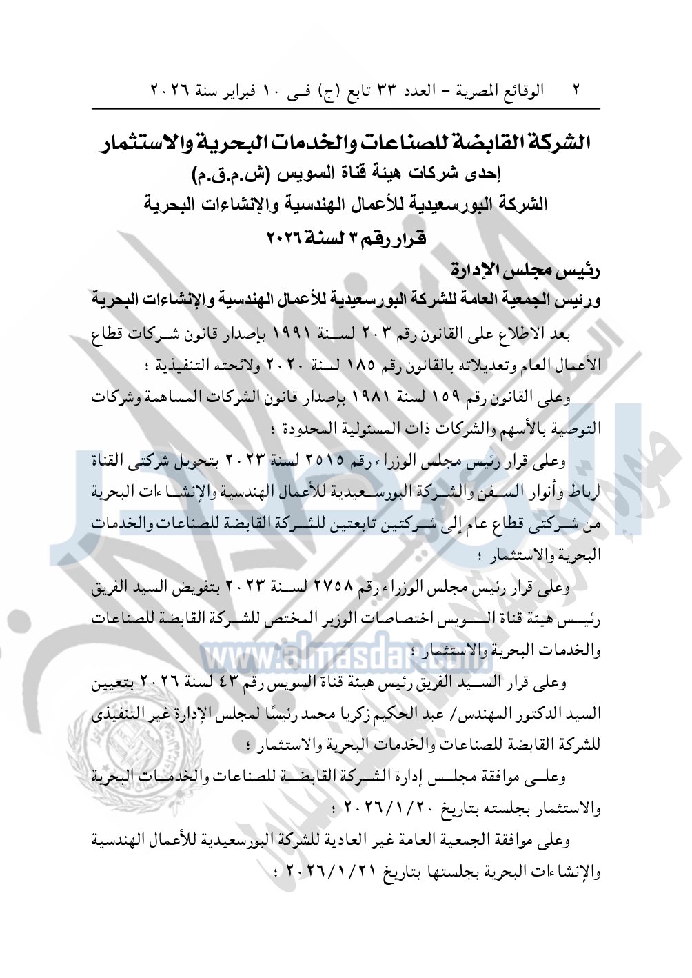 وأضافت الوقائع المصرية، أن القرار جاء بعد الاطلاع أيضا على قرار رئيس مجلس الوزراء رقم 2758 لسنة 2023 بتفويض الفريق رئيس هيئة قناة السويس اختصاصات الوزير المختص للشركة القابضة للصناعات والخدمات البحرية والاستثمار؛ وعلى قرار الفريق رئيس هيئة قناة السويس رقم 43 لسنة 2026 بتعيين الدكتور المهندس عبد الحكيم زكريا محمد رئيسًا لمجلس الإدارة غير التنفيذي للشركة القابضة للصناعات والخدمات البحرية والاستثمار؛ وعلى موافقة مجلس إدارة الشركة القابضة للصناعات والخدمات البحرية والاستثمار بجلسته بتاريخ 20-1-2026؛ وعلى موافقة الجمعية العامة غير العادية للشركة البورسعيدية للأعمال الهندسية والإنشاءات البحرية بجلستها بتاريخ 21-1-2026.