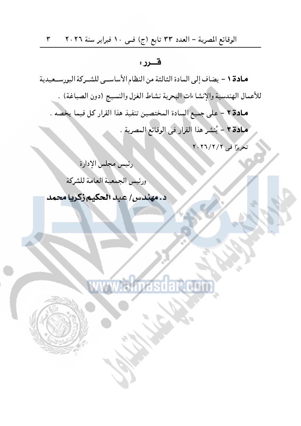 نشرت الوقائع المصرية، في العدد 33 تابع "ج"، الصادر فى 10 فبراير سنة 2026، قرار إضافة نشاط الغزل والنسيج "دون الصباغة"، إلى الشركة البورسعيدية للأعمال الهندسية والإنشاءات البحرية.