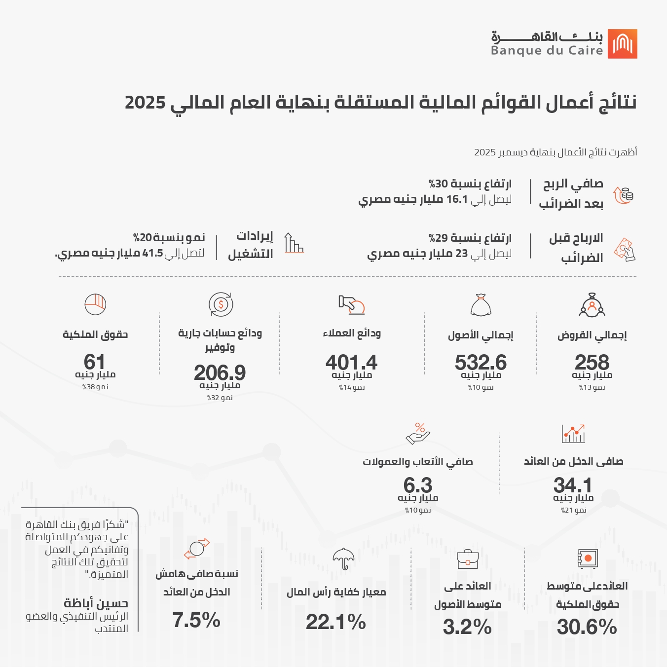 وارتفعت الأرباح قبل الضرائب لبنك القاهرة بنهاية العام المالي 2025 بنسبة 29%، مدفوعاً بتحسن نتائج أعمال البنك في مختلف القطاعات ومن أبرزها التجزئة المصرفية والخزانة وائتمان الشركات والمشروعات الصغيرة والمتوسطة.
