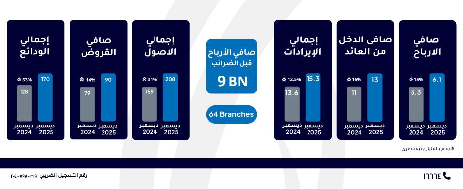 وعلى مستوى المركز المالي، ارتفعت إجمالي الأصول لتصل إلى 208 مليار جنيه بنهاية ديسمبر 2025 مقابل 159 مليار جنيه بنهاية ديسمبر 2024 بمعدل نمو31% ، فيما ارتفعت حقوق الملكية لتصل إلى 23 مليار جنيه بنهاية ديسمبر 2025 مقابل 17.4 مليار جنيه بنهاية ديسمبر 2024، محققة معدل نمو سنوي بلغ 32% ، وسجل العائد على متوسط حقوق الملكية ROAE" 33%"، والعائد على متوسط الأصول ROAA" 3.6%"، بينما سجلت نسبة التكلفة إلى الدخل 30%.