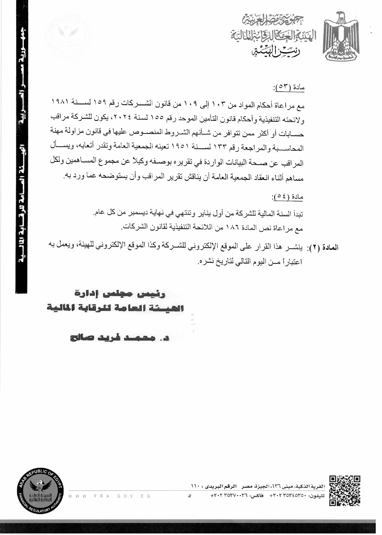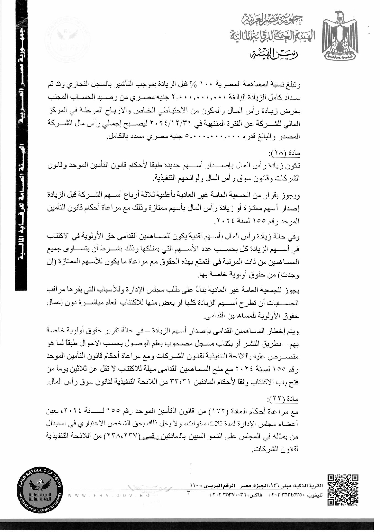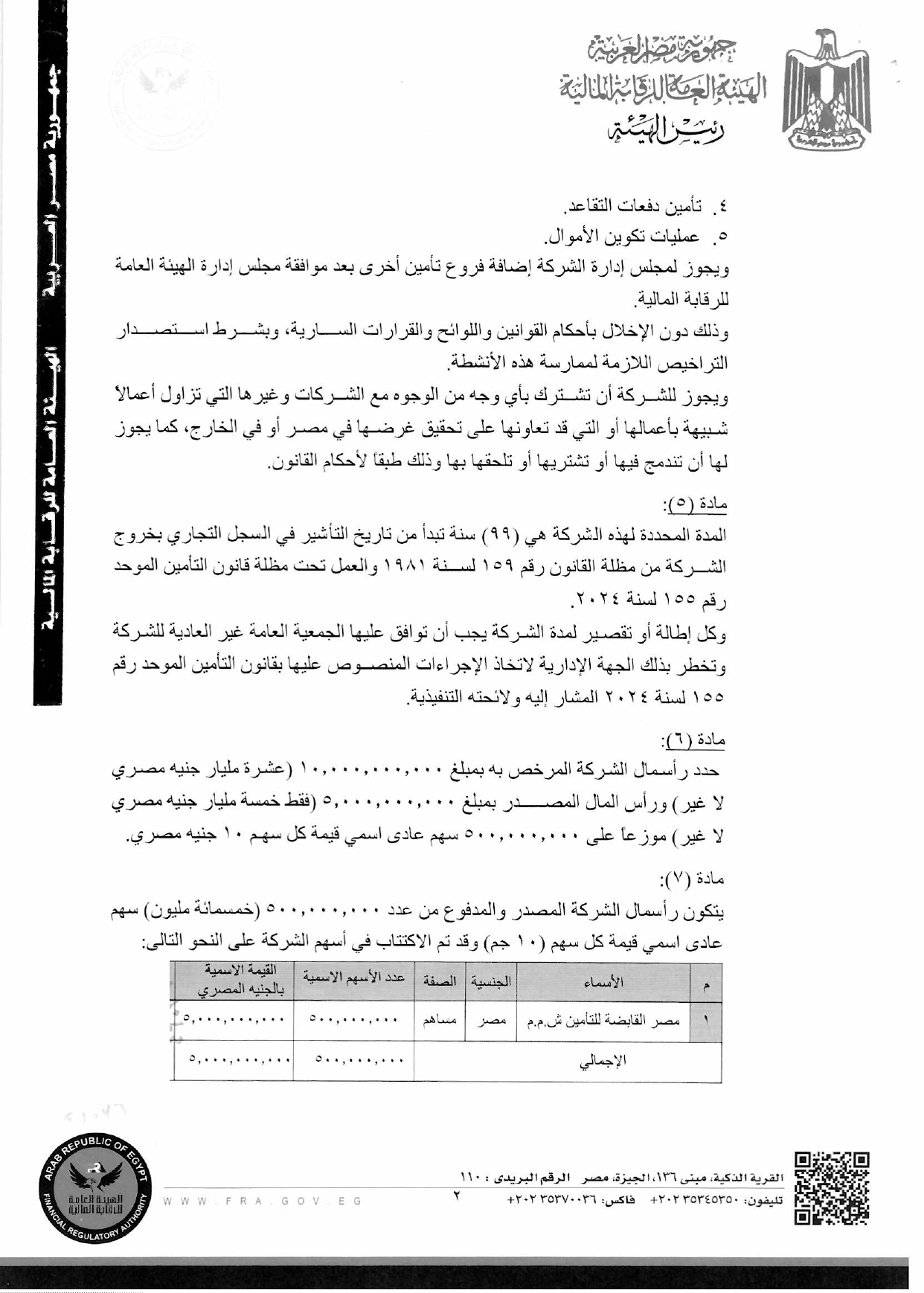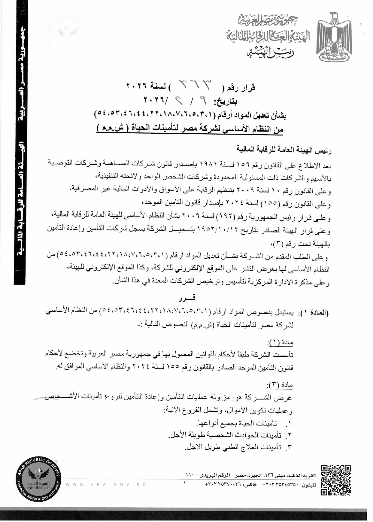 أصدرت الهيئة العامة للرقابة المالية، قرارًا رقم 363 لسنة 2026، بشأن الموافقة على تعديل 11 مادة من النظام الأساسي لشركة مصر لتأمينات الحياة أرقامهم "1، 3، 5، 6، 7، 18، 22، 44، 46، 53، 54".