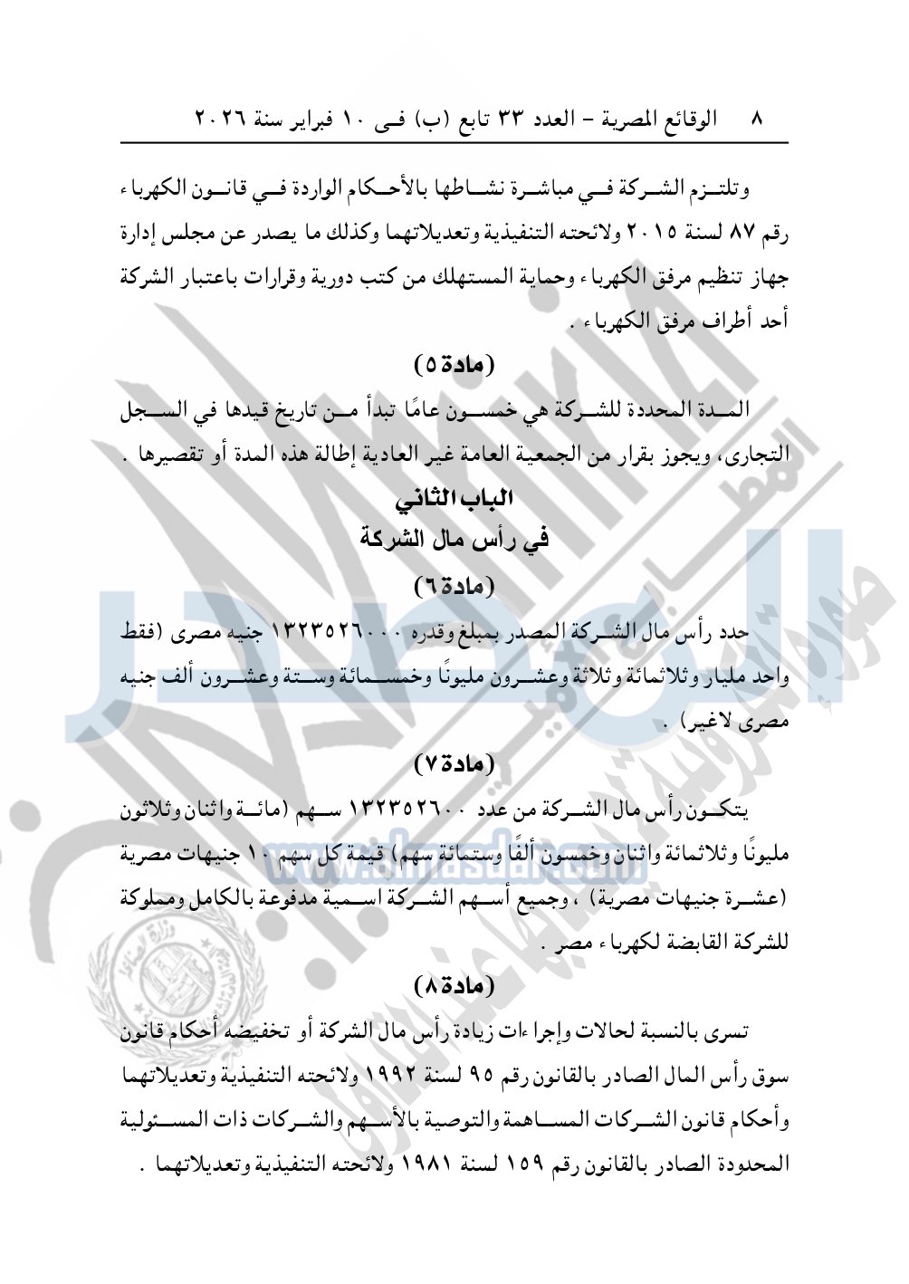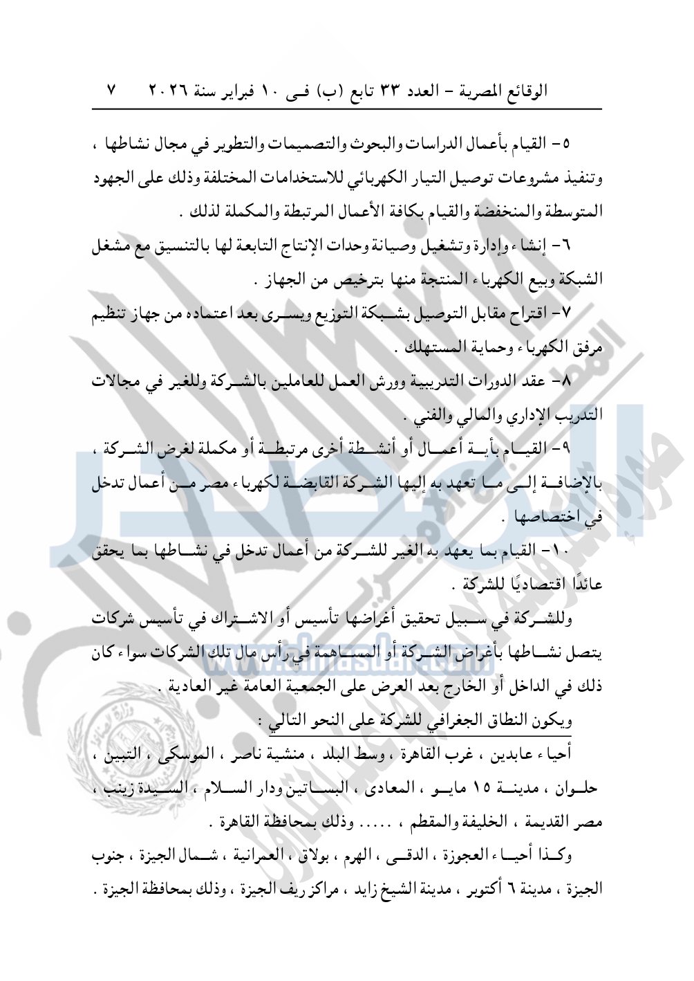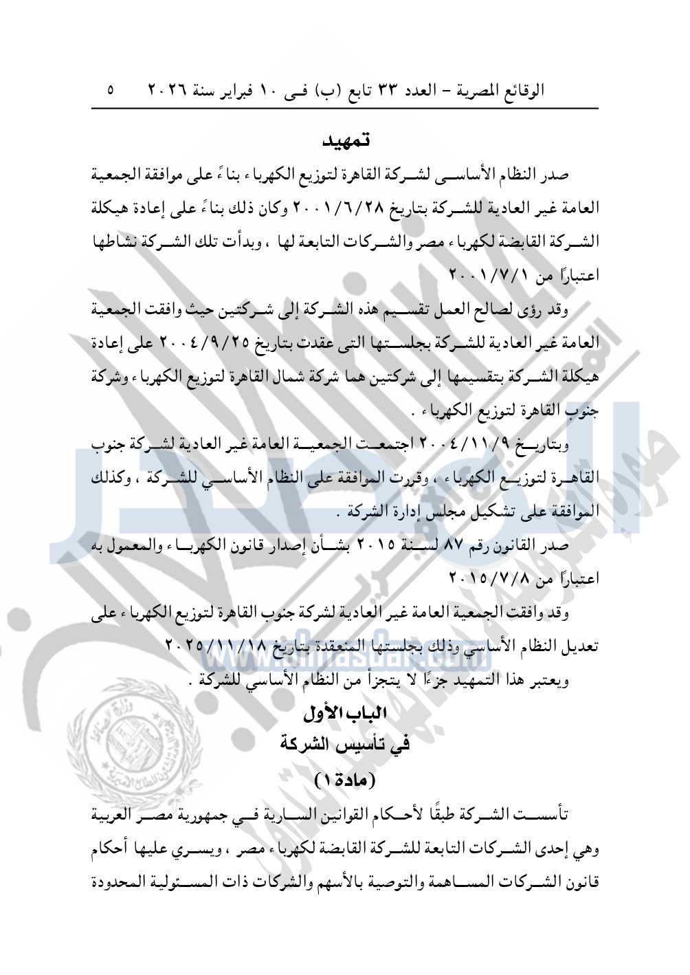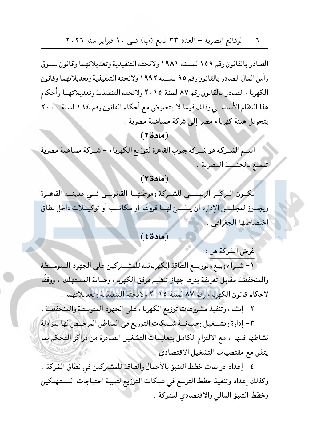 نشرت الوقائع المصرية، في العدد 33 تابع "ب"، الصادر في 10 فبراير سنة 2026، الشركة القابضة لكهرباء مصر، قرار الجمعية العامة غير العادية، لشركة جنوب القاهرة لتوزيع الكهرباء، المنعقدة بتاريخ 18-11-2025.