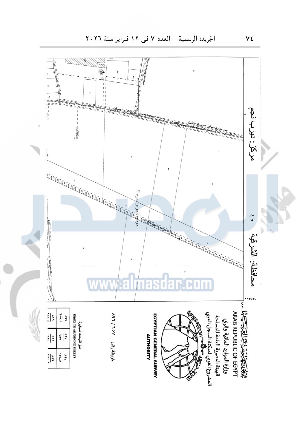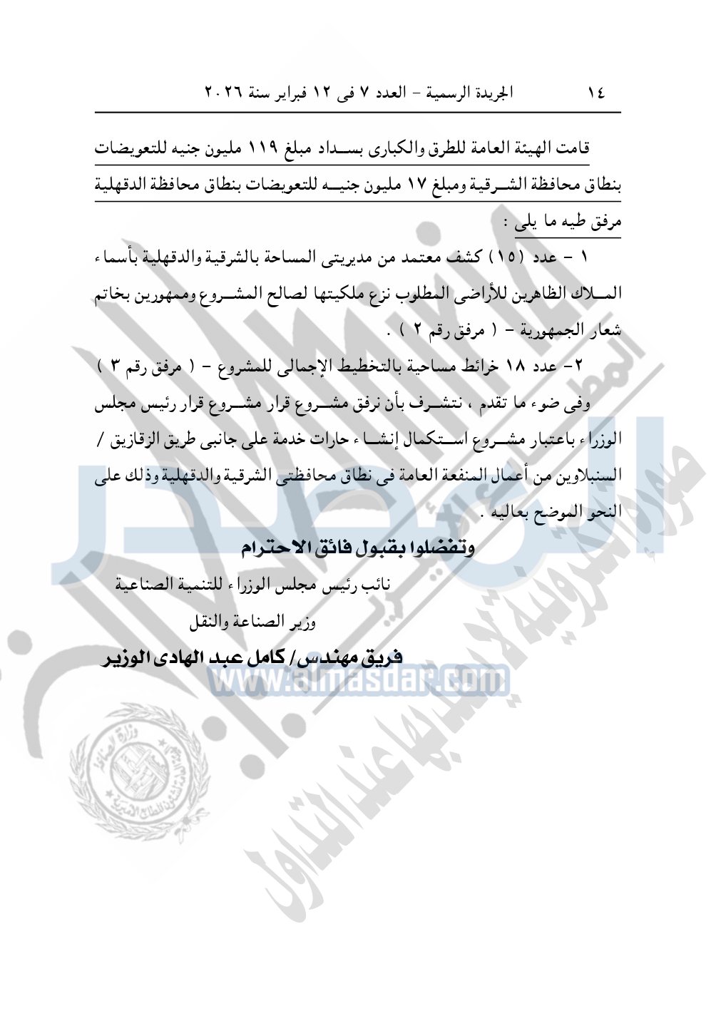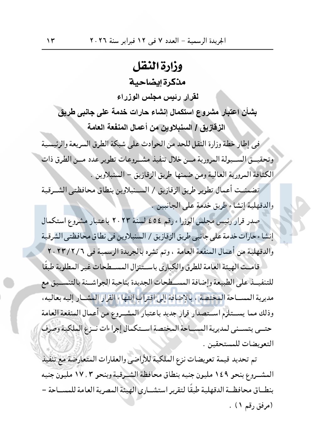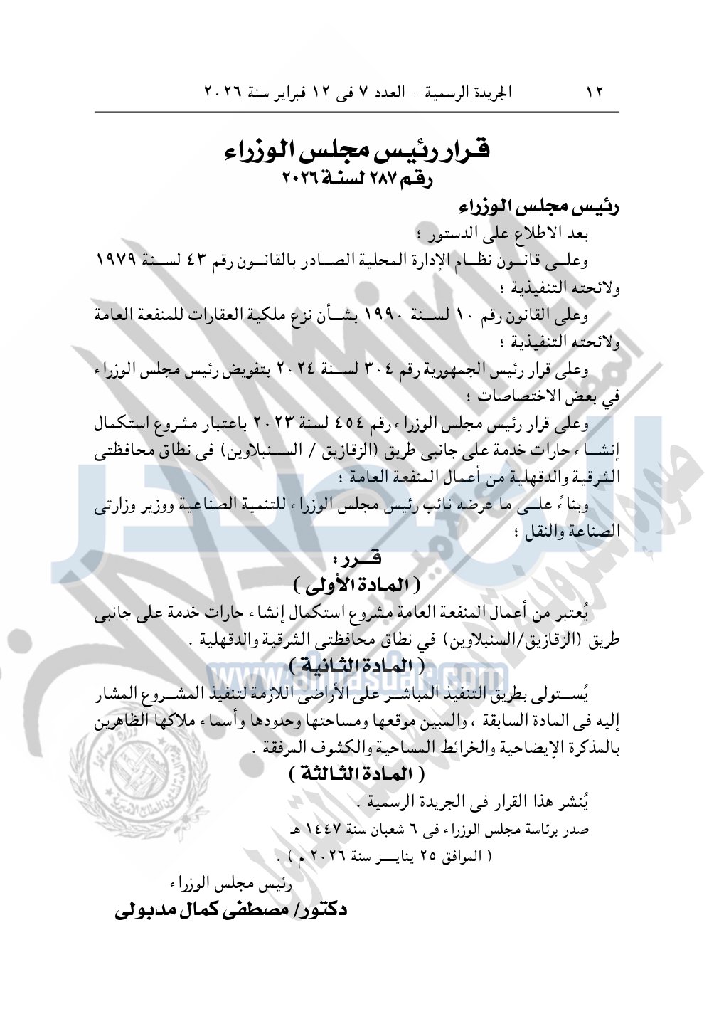 نشرت الجريدة الرسمية، في العدد 7، الصادر في 12 فبراير سنة 2026، قرار رئيس مجلس الوزراء، رقم 287 لسنة 2026، بشأن نزع ملكية بعض الأراضي لإنشاء استكمال مشروع استكمال إنشاء حارات خدمة على جانبي طريق "الزقازيق - السنبلاوين" في محافظتى الشرقية والدقهلية.