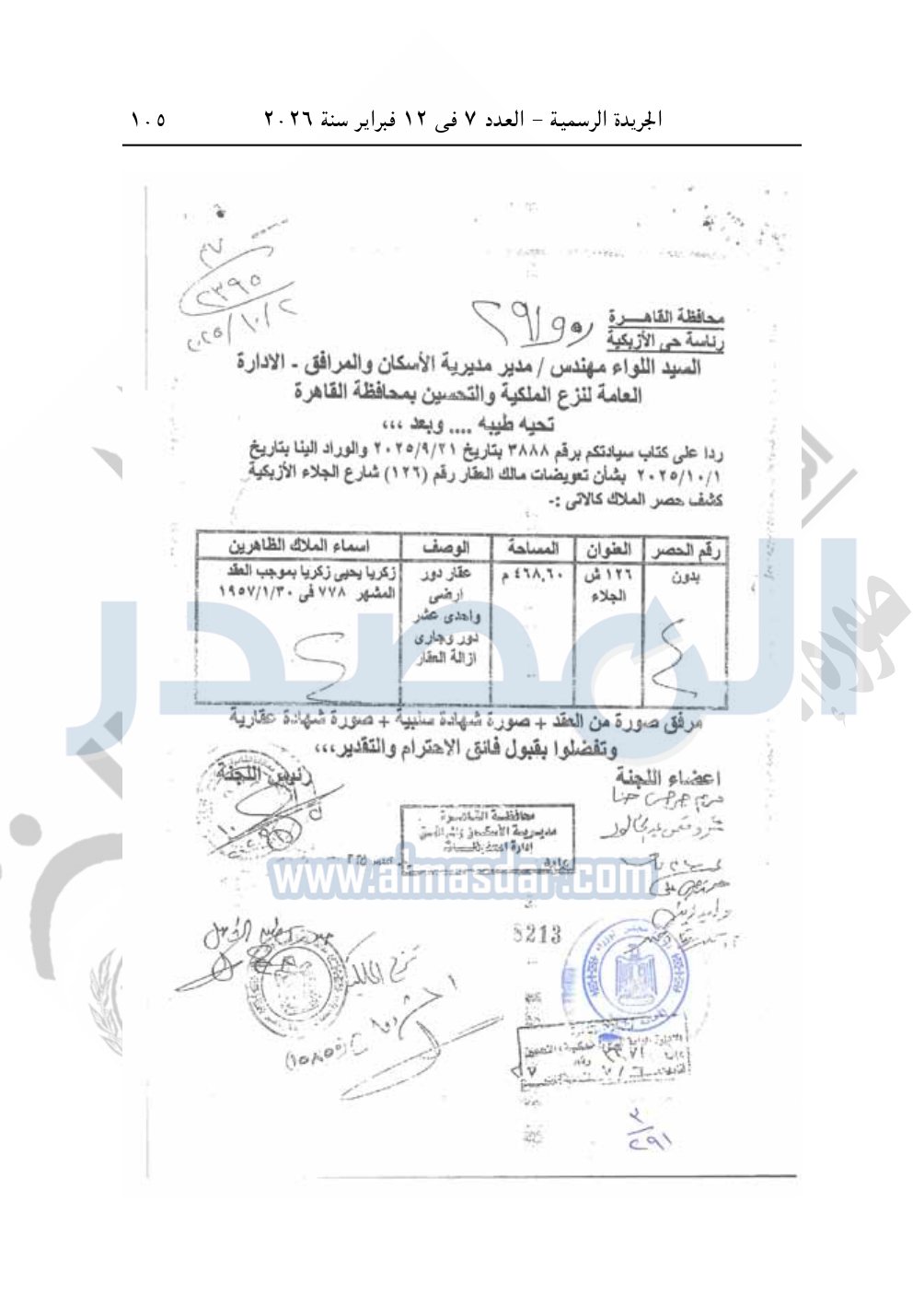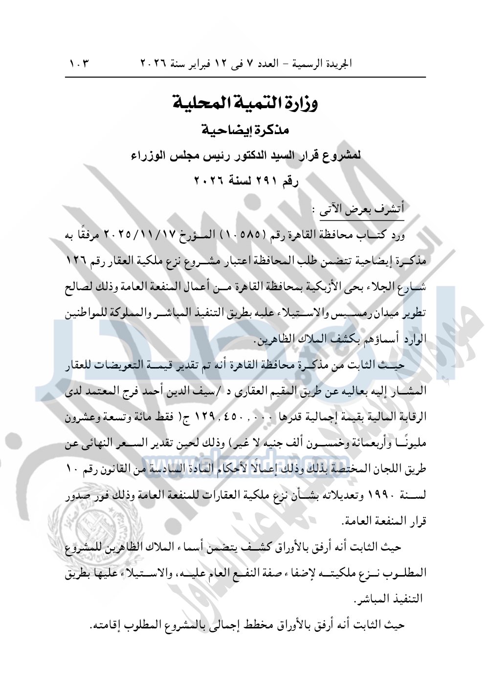 نشرت الجريدة الرسمية، في العدد 7، الصادر في 12 فبراير سنة 2026، قرار رئيس مجلس الوزراء، رقم 291 لسنة 2026، بشأن نزع ملكية العقار رقم "126" شارع الجلاء بحى الأزبكية - محافظة القاهرة.