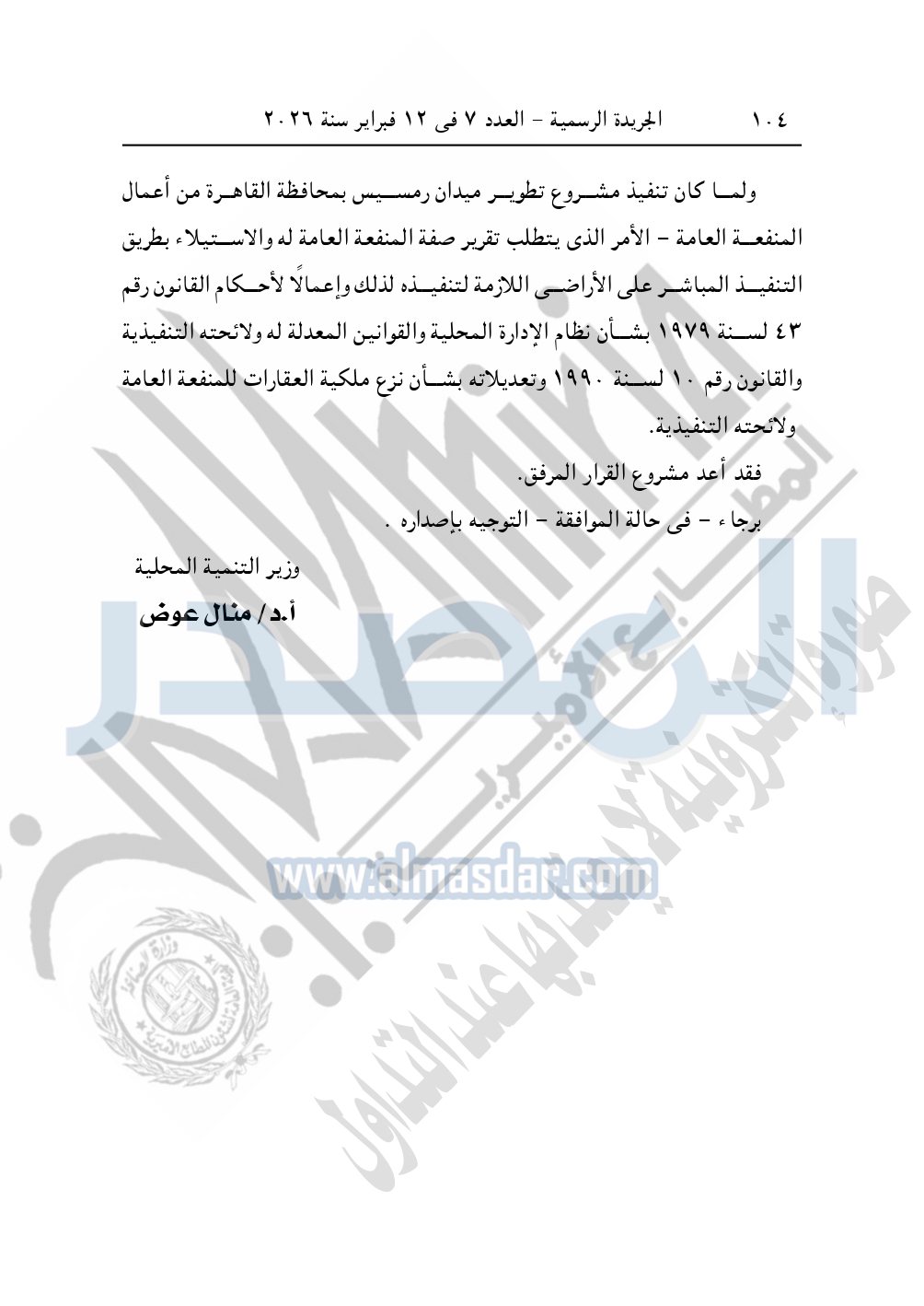 يُعتبر من أعمال المنفعة العامة مشروع نزع ملكية العقار رقم "126" شارع الجلاء بحى الأزبكية - محافظة القاهرة، وذلك لصالح تطوير منطقة ميدان رمسيس.