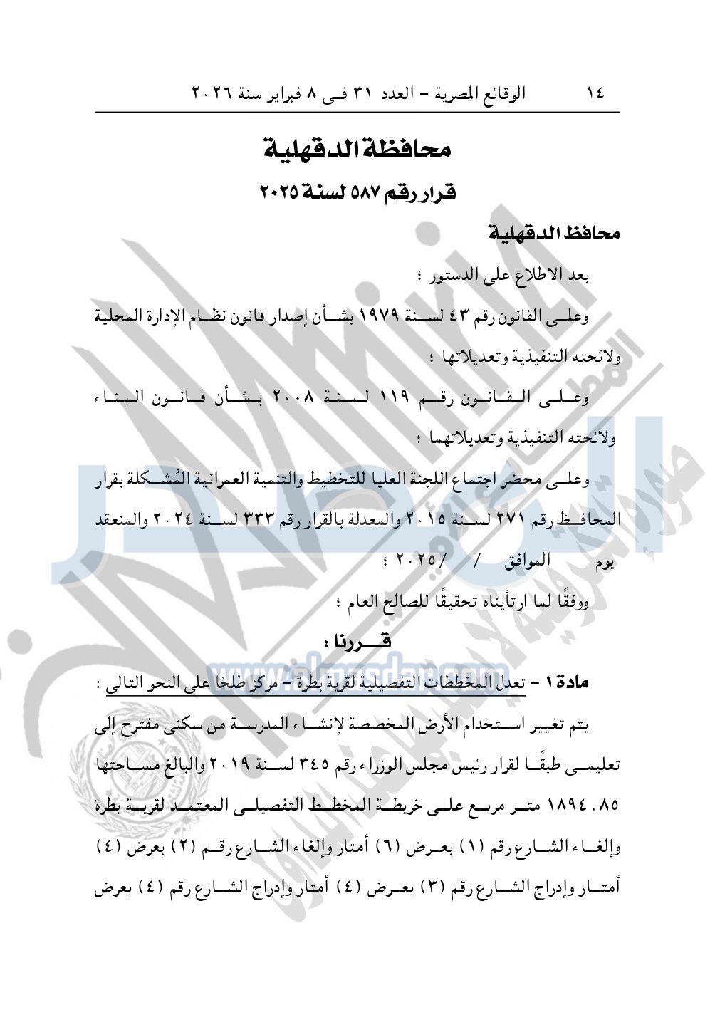 كما نشرت الوقائع المصرية في العدد 31، الصادر في 8 فبراير سنة 2026، محافظة الدقهلية، رقم 587 لسنة 2025، بشأن تعديل المخططات التفصيلية لقرية بطرة.