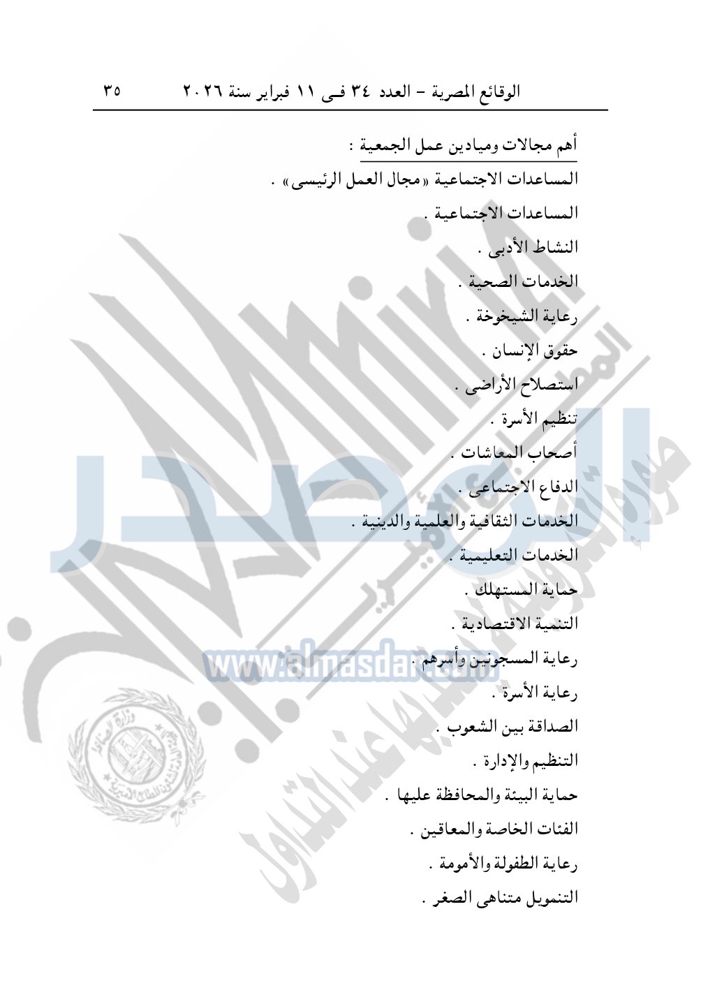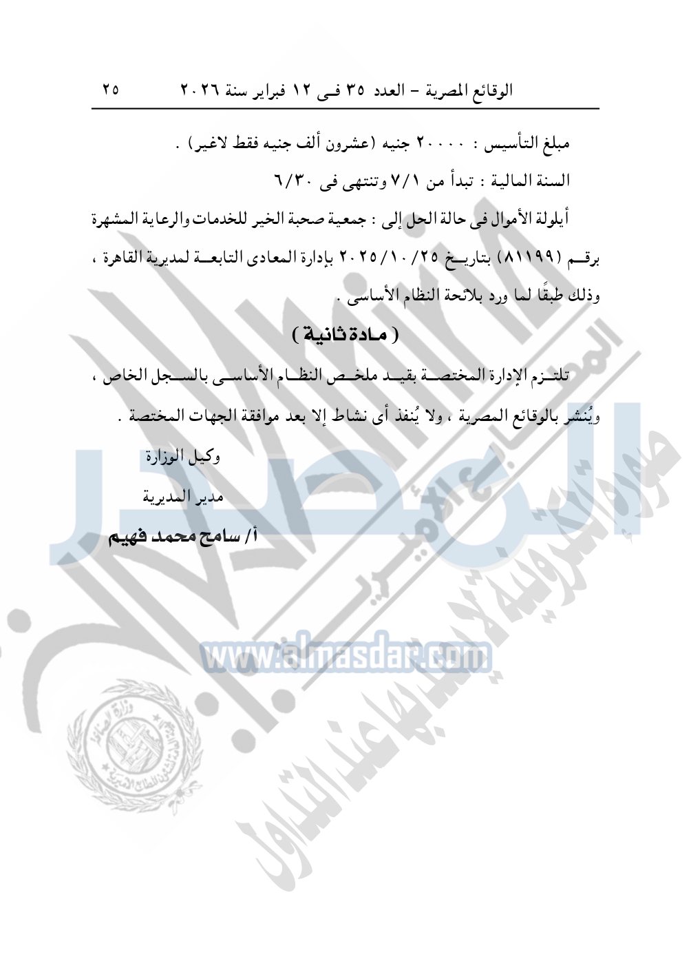 وأيضا نشرت الوقائع المصرية في العدد 35، الصادر في 12 فبراير 2026، قرار مديرية التضامن الاجتماعي بالقاهرة، قيد رقم 12588 لسنة 2025، بتاريخ 9-12-2025، بشأن قيد مؤسسة كنز البيان الخيرية.