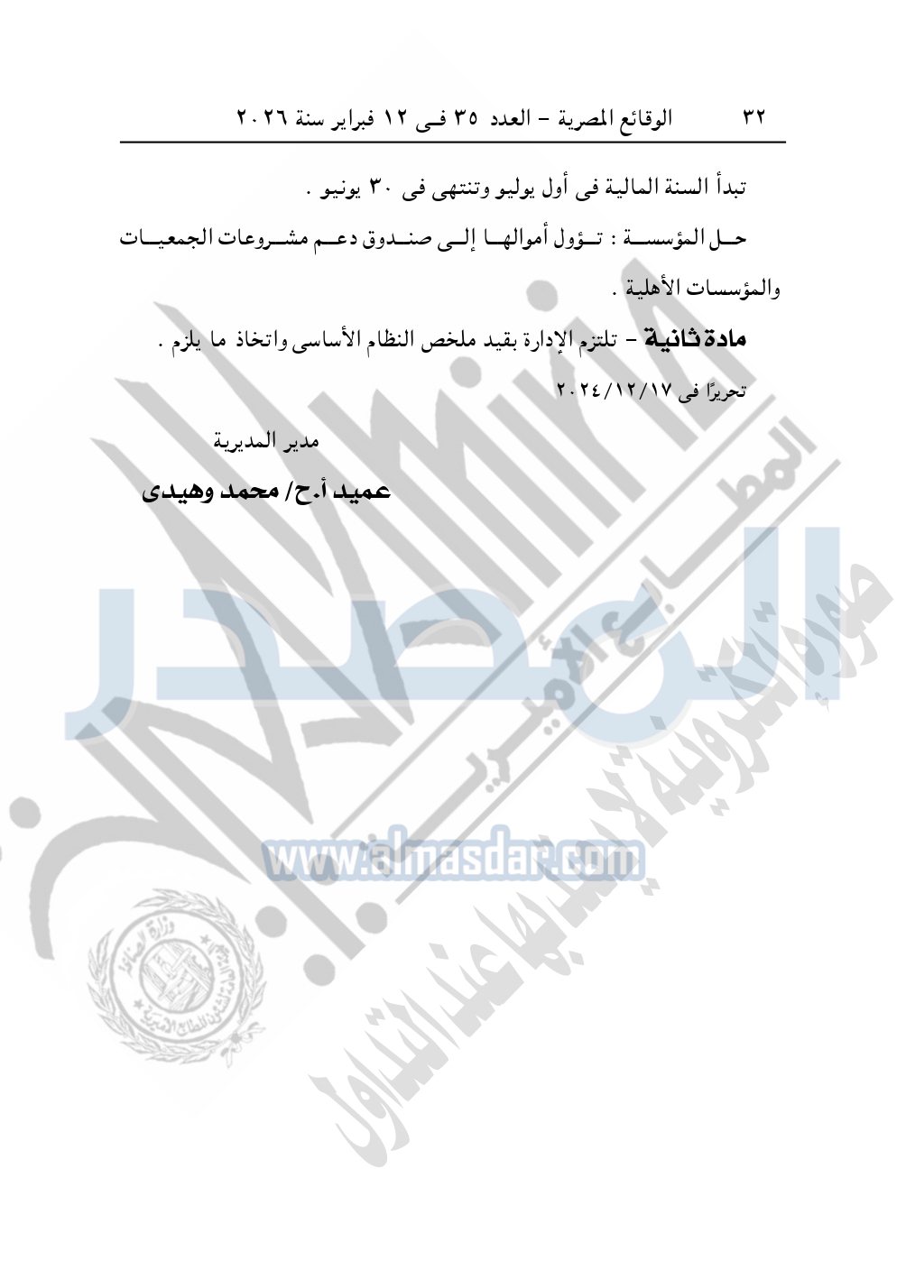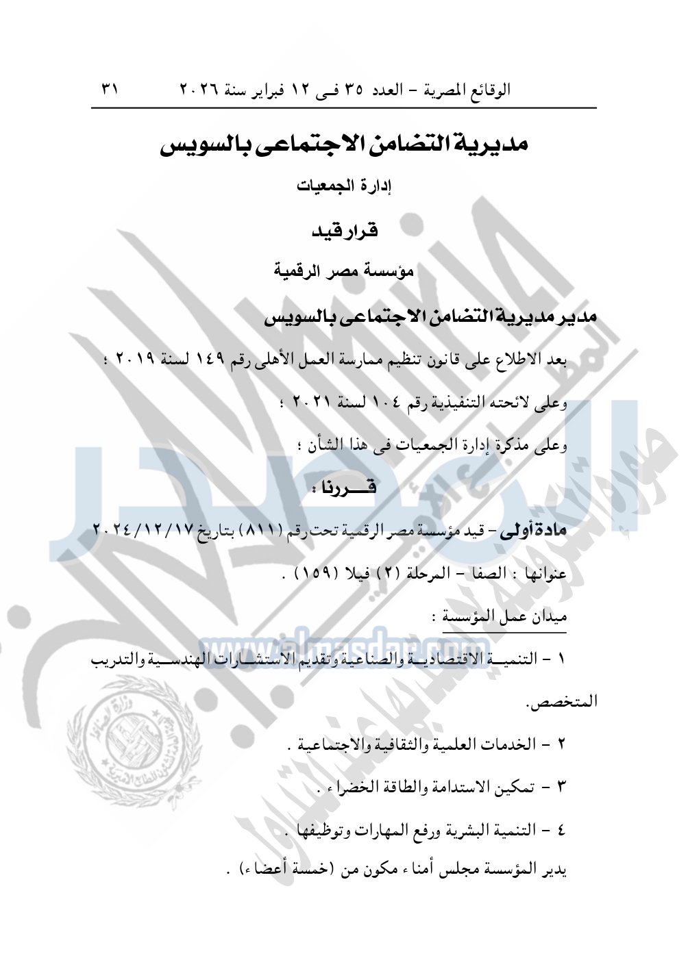 كما نشرت الوقائع المصرية في العدد 35، الصادر في 12 فبراير 2026، قرار مديرية التضامن الاجتماعي بالسويس، بشأن قيد مؤسسة مصر الرقمية.
