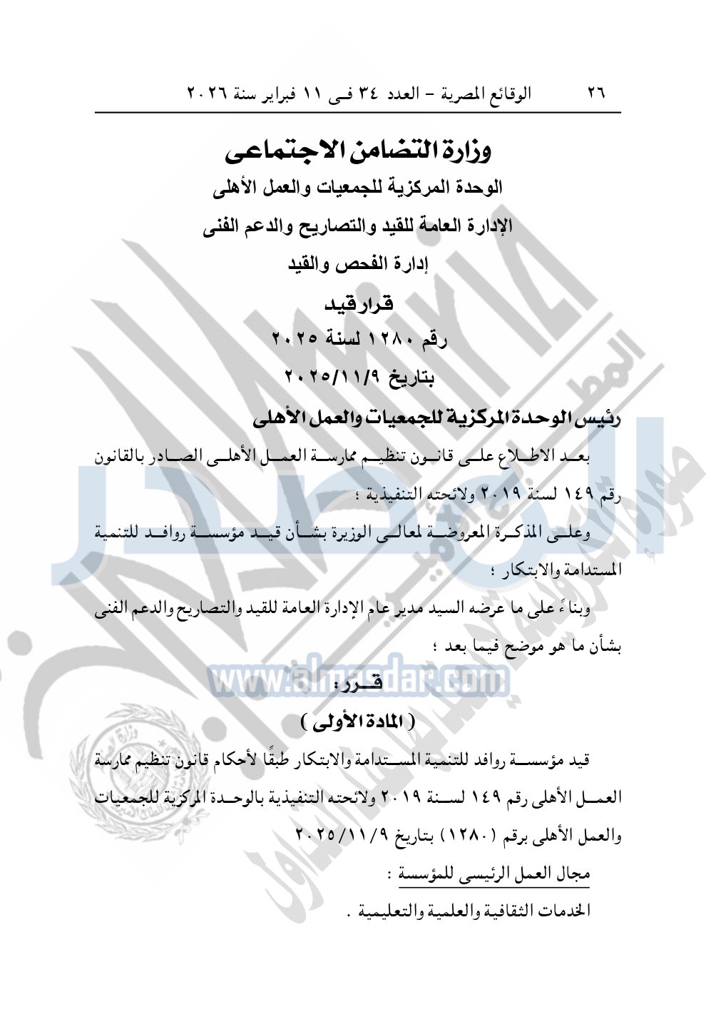 ونشرت الوقائع المصرية في العدد 34، الصادر في 11 فبراير 2026، قرار وزارة التضامن الاجتماعي، قيد رقم 1280 لسنة 2025، بتاريخ 9-11-2025، بشأن قيد مؤسسة روافد للتنمية المستدامة والابتكار.