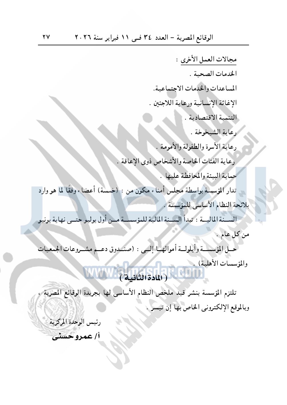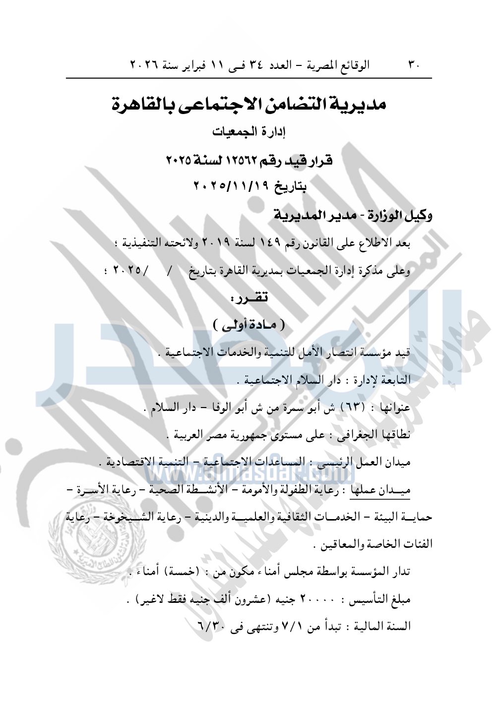 وأيضا نشرت الوقائع المصرية في العدد 34، الصادر في 11 فبراير 2026، قرار مديرية التضامن الاجتماعي بالقاهرة، قيد رقم 12562 لسنة 2025، بتاريخ 19-11-2025، بشأن قيد مؤسسة انتصار الأمل للتنمية والخدمات الاجتماعية.