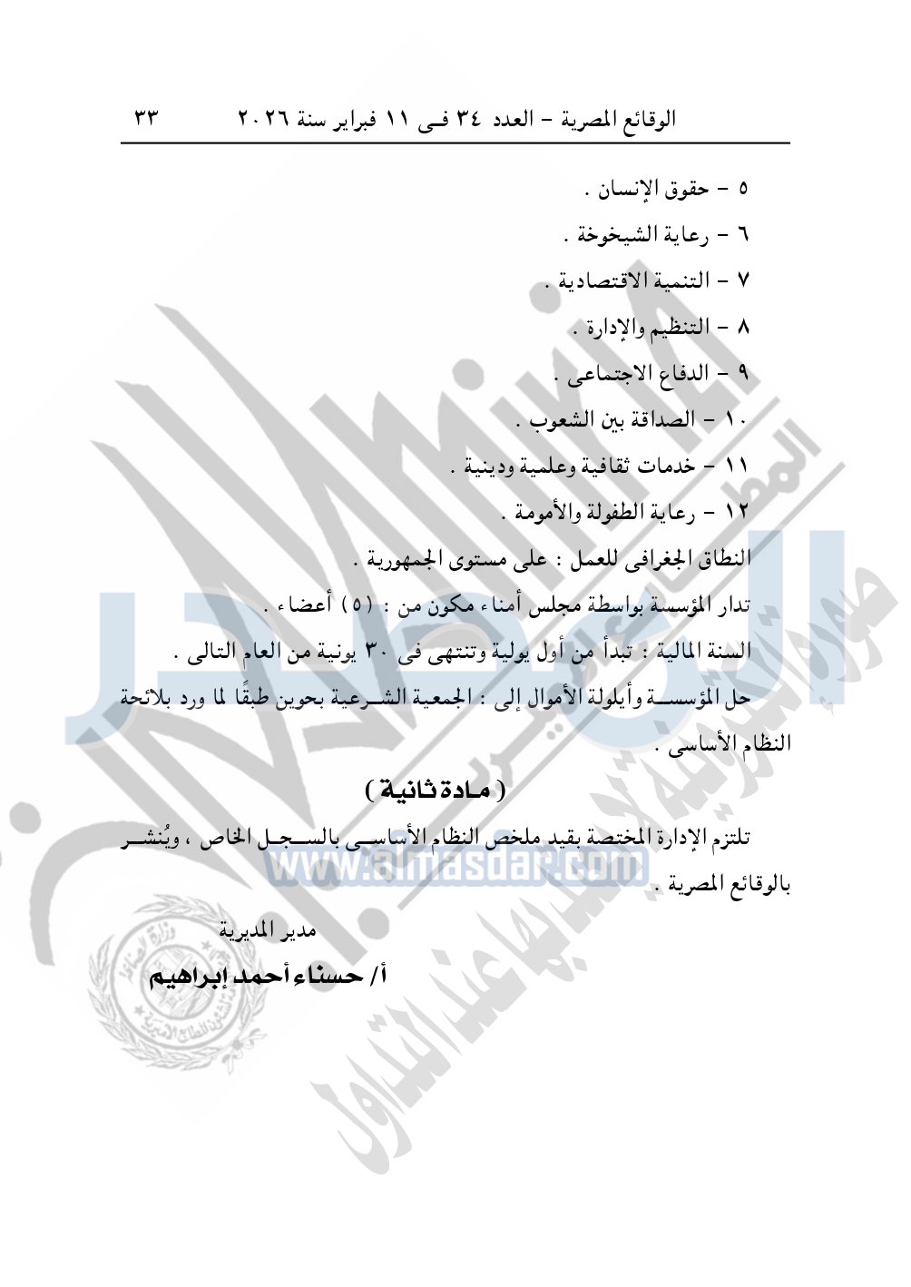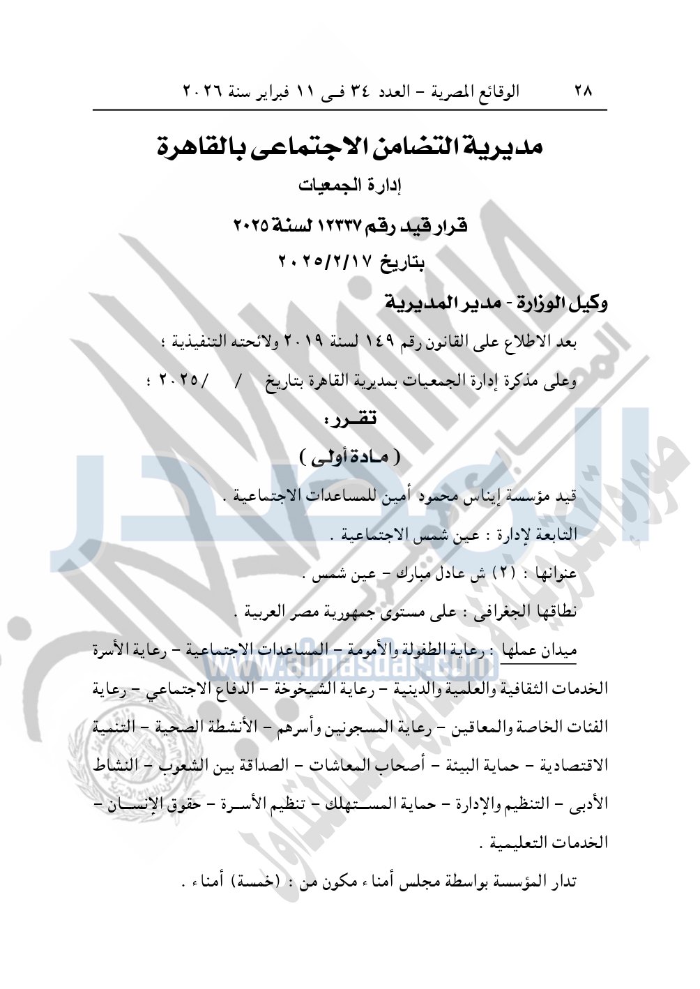 كما نشرت الوقائع المصرية في العدد 34، الصادر في 11 فبراير 2026، قرار مديرية التضامن الاجتماعي بالقاهرة، قيد رقم 12337 لسنة 2025، بتاريخ 17-2-2025، بشأن قيد مؤسسة إيناس محمود أمين للمساعدات الاجتماعية.