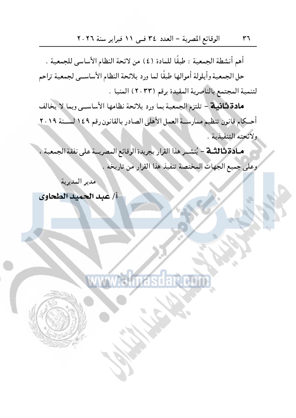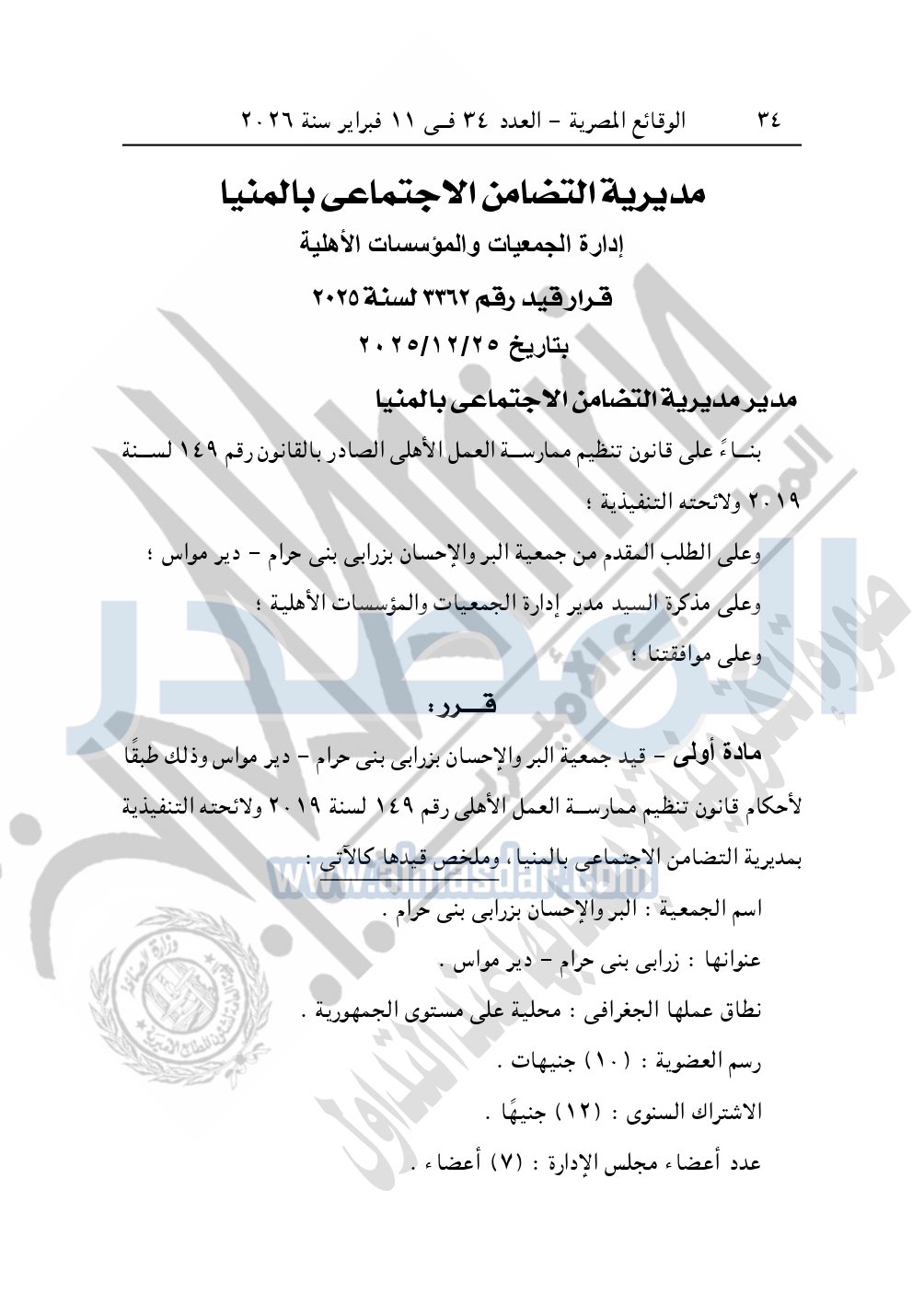 ونشرت الوقائع المصرية في العدد 34، الصادر في 11 فبراير 2026، قرار مديرية التضامن الاجتماعي بالمنيا، قيد رقم 3362 لسنة 2025، بتاريخ 25-12-2025، بشأن قيد جمعية البر والإحسان بزرابي بنى حرام – دير مواس.