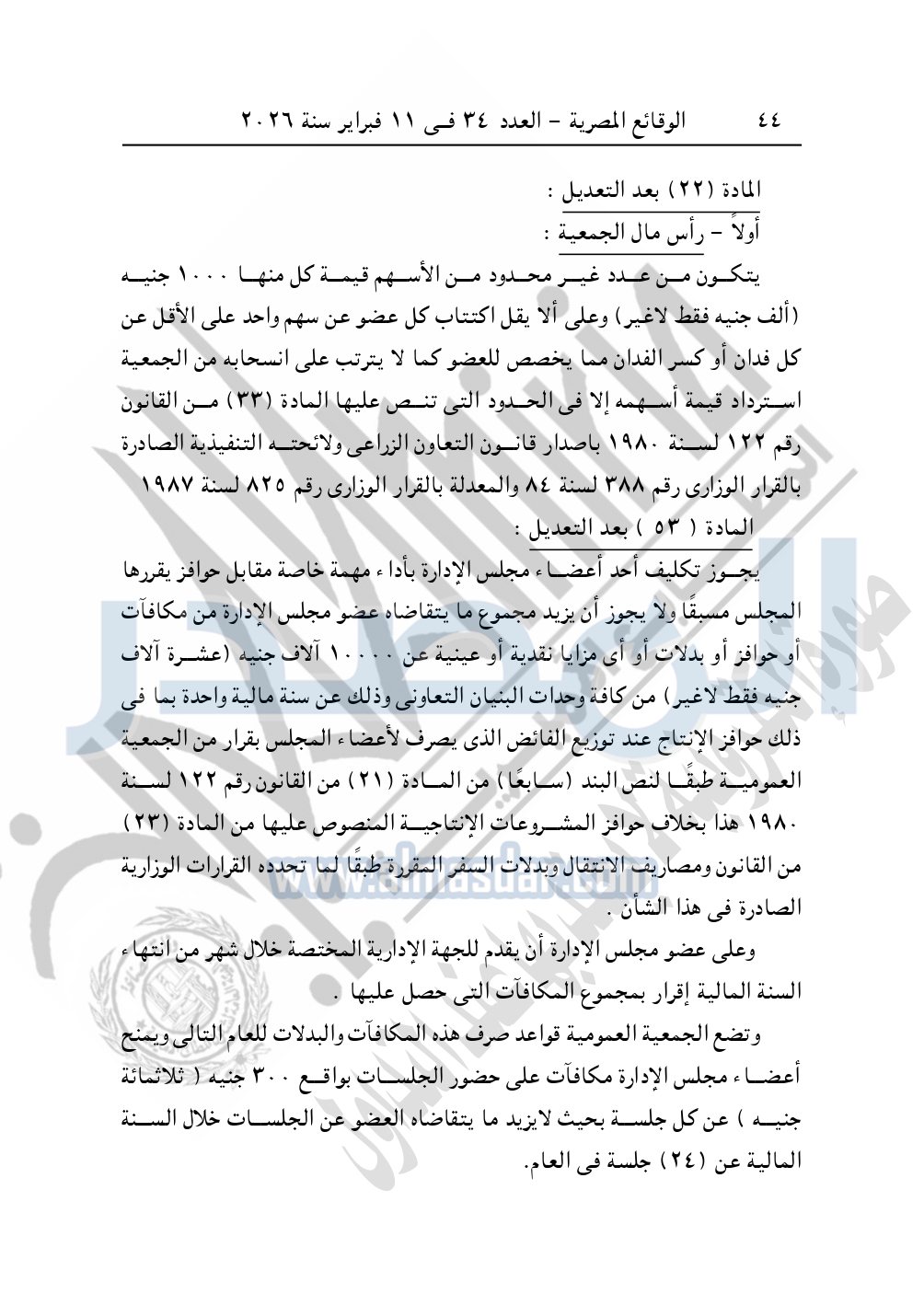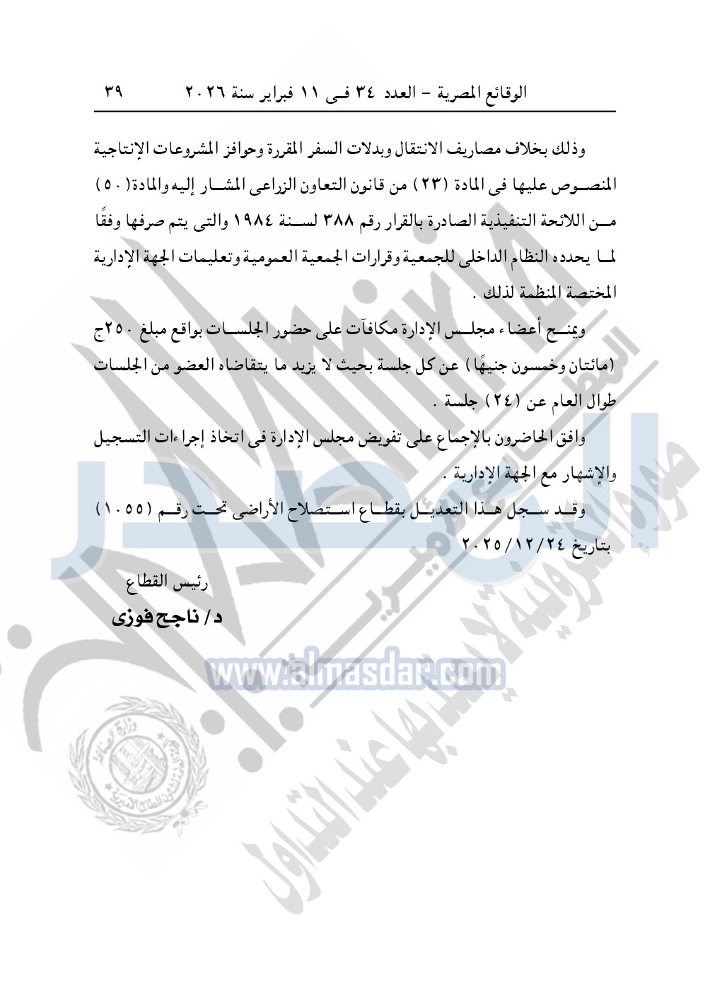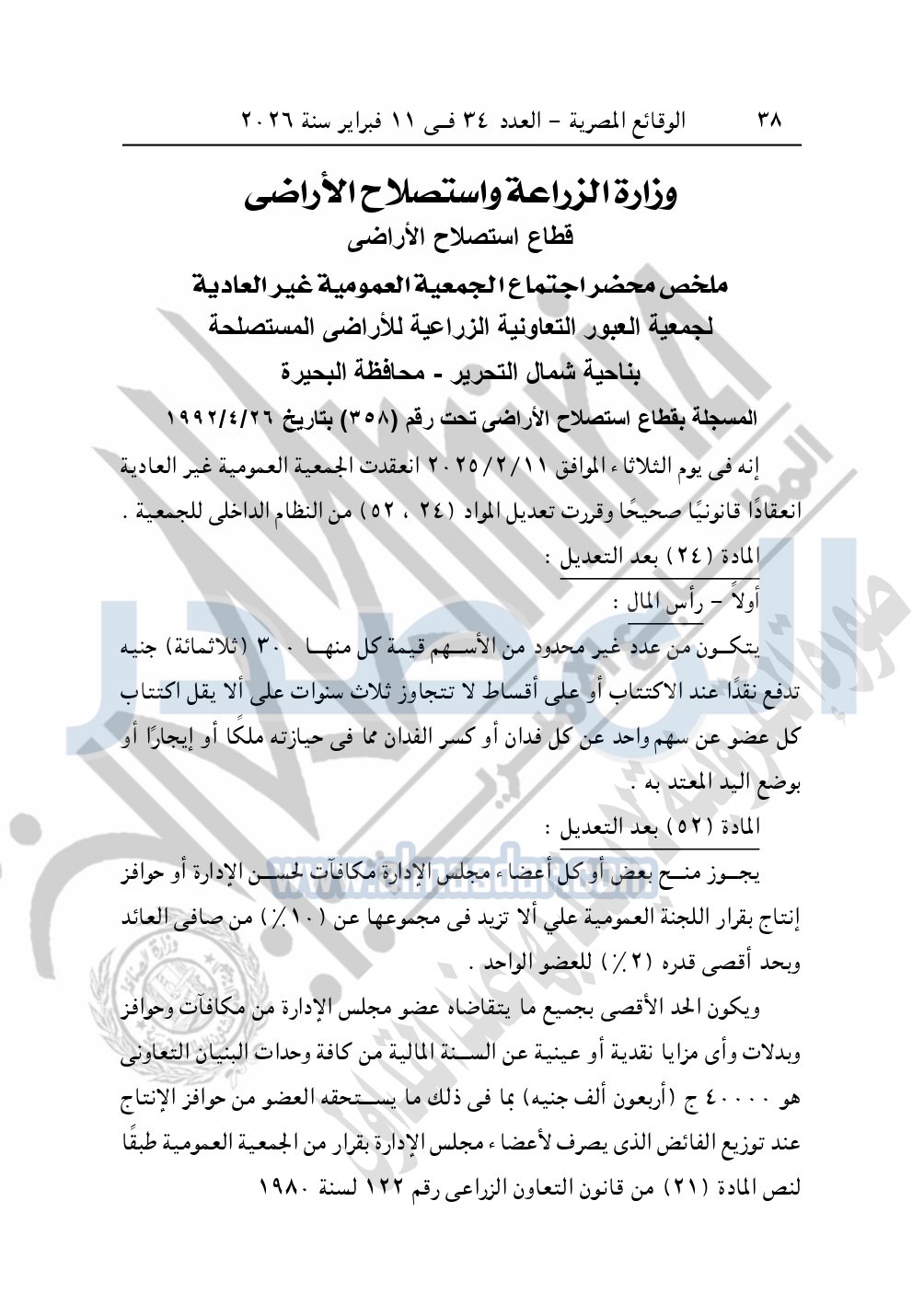 نشرت الوقائع المصرية في العدد 34، الصادر بتاريخ 11 فبراير 2026، قرار وزارة الزراعة واستصلاح الأراضى، قطاع استصلاح الأراضى، بشأن ملخص محضر اجتماع الجمعية العمومية غير العادية لجمعية العبور التعاونية الزراعية للأراضي المستصلحة بناحية شمال التحرير - محافظة البحيرة، المسجلة بقطاع استصلاح الأراضى تحت رقم "358" بتاريخ 26-4-1992.