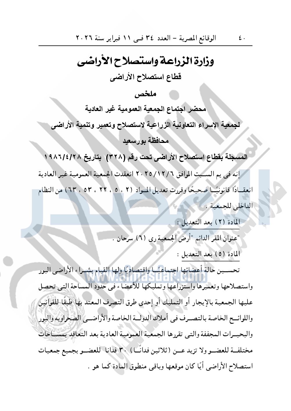 كما نشرت الوقائع المصرية في العدد 34، الصادر بتاريخ 11 فبراير 2026، قرار وزارة الزراعة واستصلاح الأراضى، قطاع استصلاح الأراضى، بشأن ملخص محضر اجتماع الجمعية العمومية غير العادية لجمعية الإسراء التعاونية الزراعية لاستصلاح وتعمير وتنمية الأراضى محافظة بورسعيد، المسجلة بقطاع استصلاح الأراضى تحت رقم "328" بتاريخ 28-4-1986.