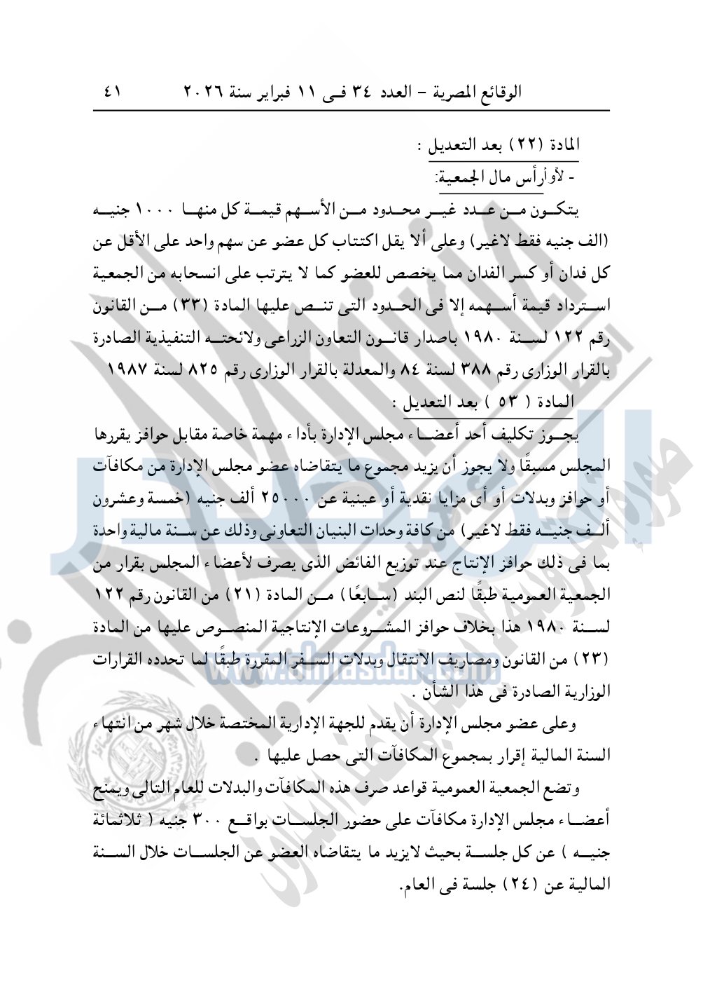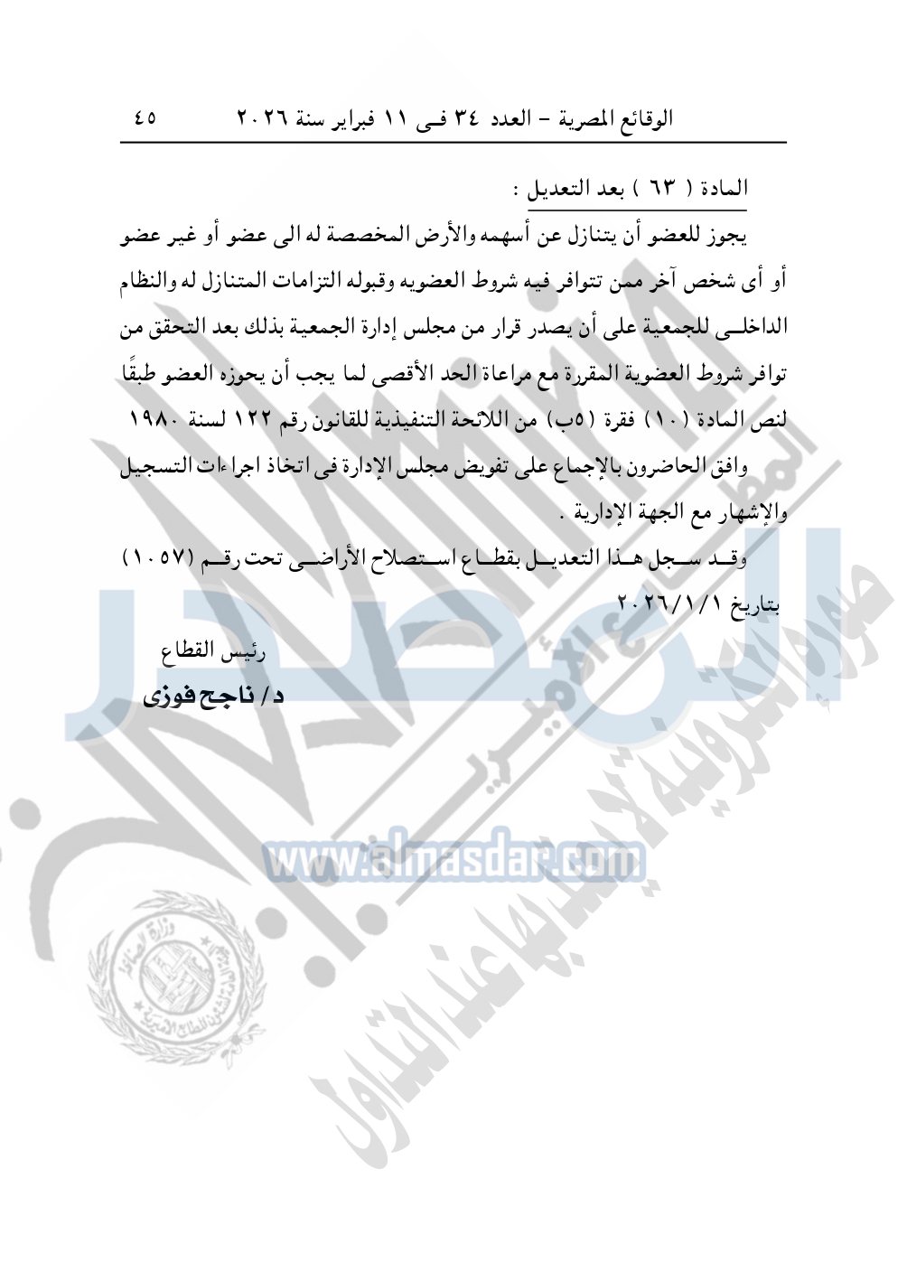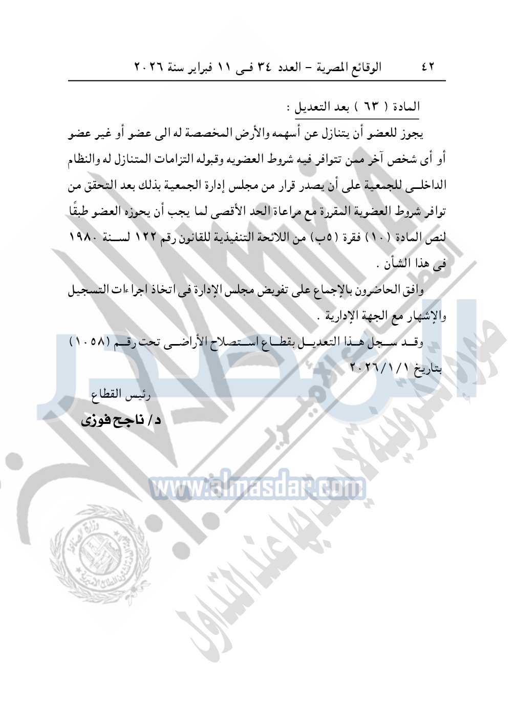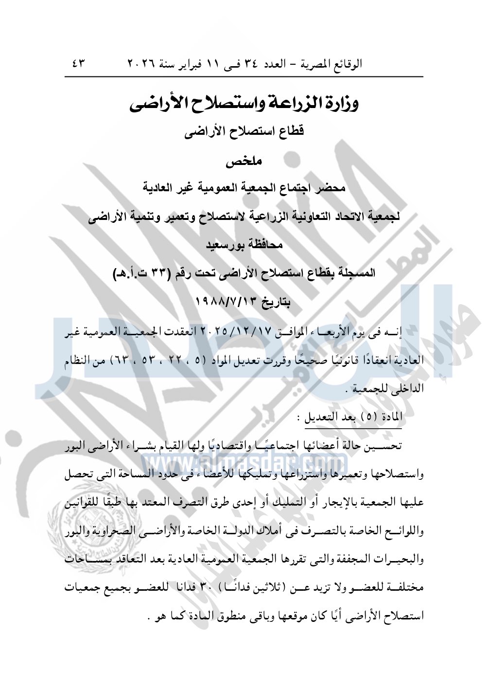 وأيضا نشرت الوقائع المصرية في العدد 34، الصادر بتاريخ 11 فبراير 2026، قرار وزارة الزراعة واستصلاح الأراضى، قطاع استصلاح الأراضى، بشأن ملخص محضر اجتماع الجمعية العمومية غير العادية لجمعية الاتحاد التعاونية الزراعية لاستصلاح وتعمير وتنمية الأراضى محافظة بورسعيد، المسجلة بقطاع استصلاح الأراضى تحت رقم "33 ت.أ.هـ"، بتاريخ 13-7-1988.