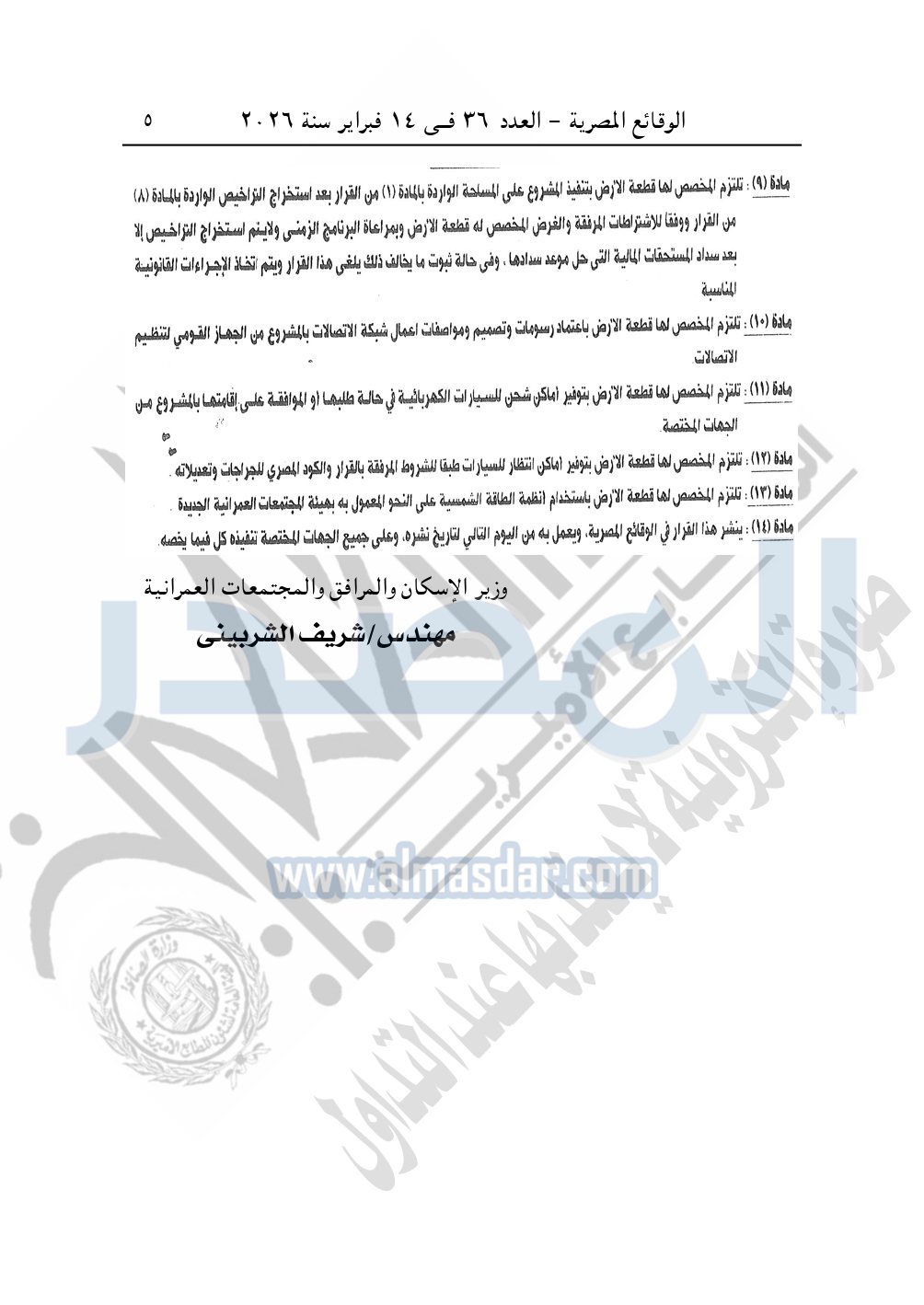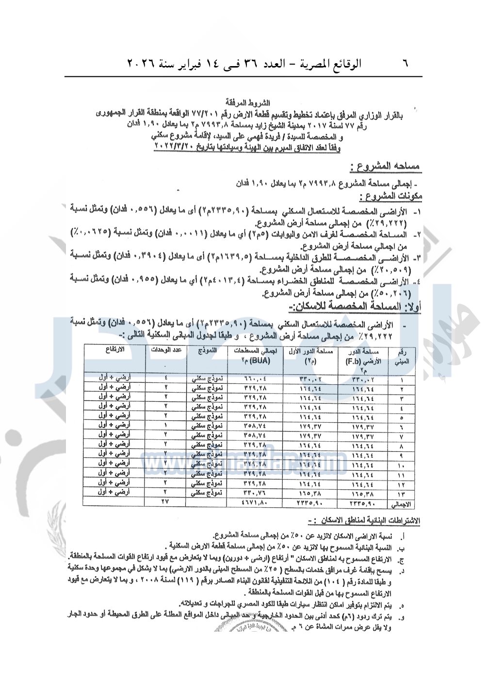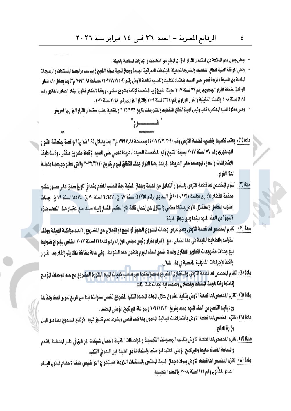 نشرت الوقائع المصرية، في العدد 36، الصادر في 14 فبراير سنة 2026، قرار وزارة الإسكان والمرافق والمجتمعات العمرانية، رقم 144 لسنة 2025، بتاريخ 25-1-2025، بشأن اعتماد تخطيط وتقسيم قطعة الأرض رقم "201 / 77 / 2017" بمساحة 7993.8م2 بما يعادل 1.9 فدان الواقعة بمنطقة القرار الجمهورى رقم 77 لسنة 2017 بمدينة الشيخ زايد المخصصة لفريدة فهمى على السيد لإقامة مشروع سكنى.