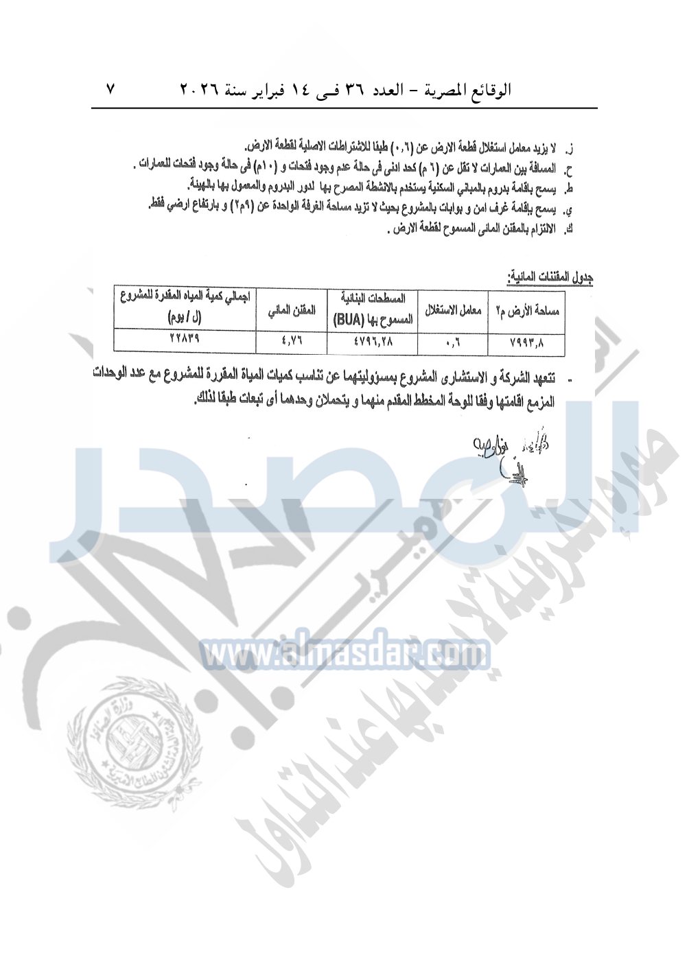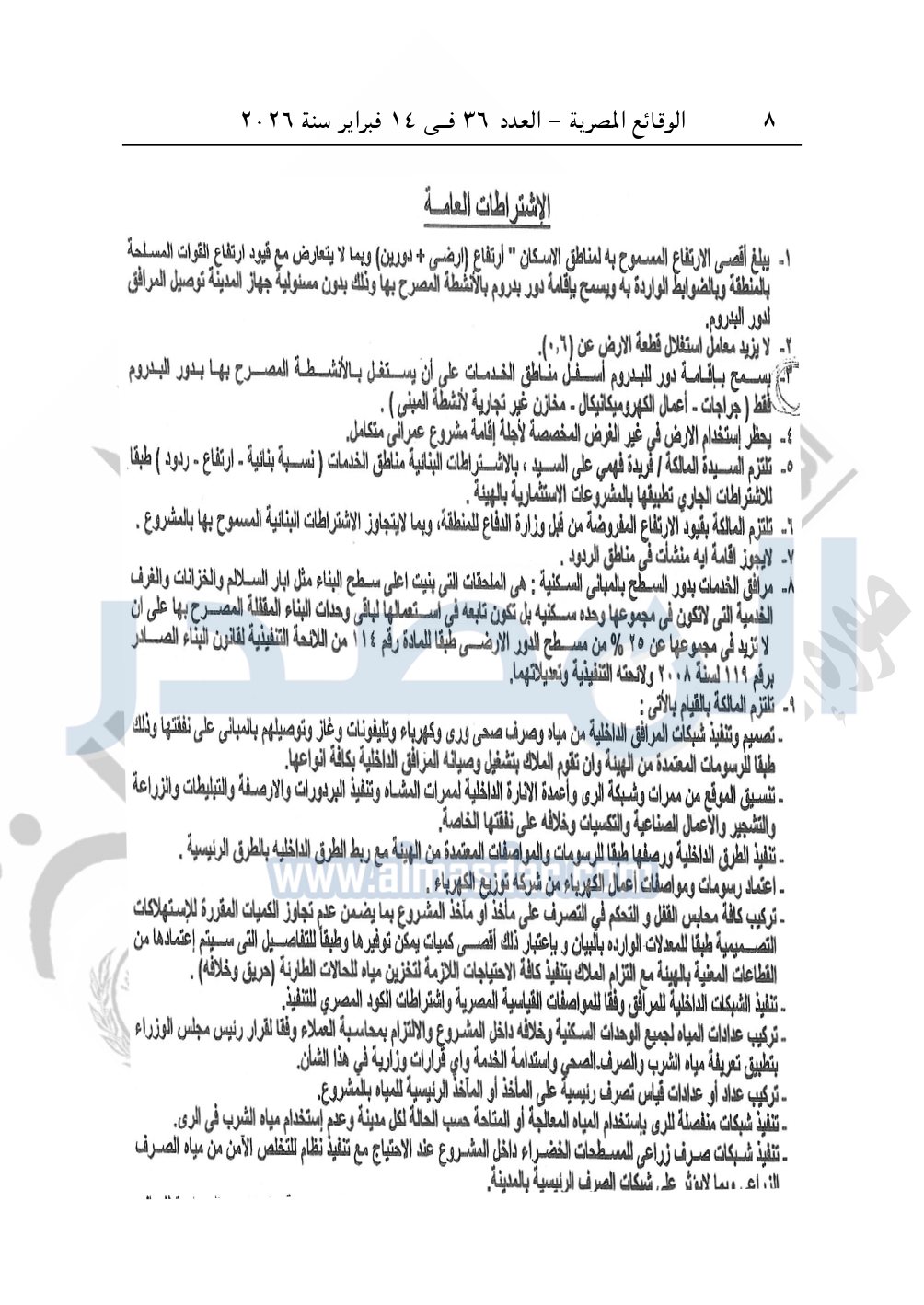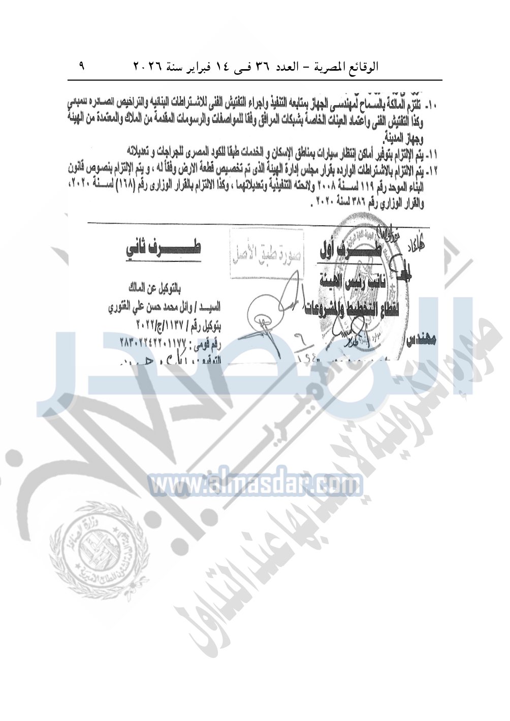 نشرت الوقائع المصرية، في العدد 36، الصادر في 14 فبراير سنة 2026، قرار وزارة الإسكان والمرافق والمجتمعات العمرانية، رقم 144 لسنة 2025، بتاريخ 25-1-2025، بشأن اعتماد تخطيط وتقسيم قطعة الأرض رقم "201 / 77 / 2017" بمساحة 7993.8م2 بما يعادل 1.9 فدان الواقعة بمنطقة القرار الجمهورى رقم 77 لسنة 2017 بمدينة الشيخ زايد المخصصة لفريدة فهمى على السيد لإقامة مشروع سكنى.