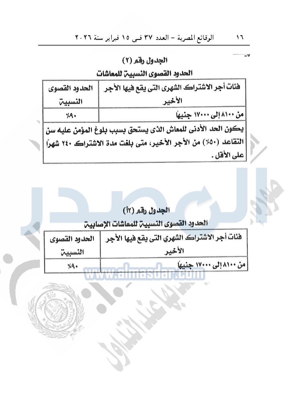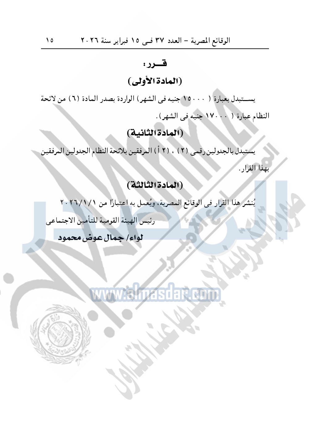 نشرت الوقائع المصرية، في العدد 37، الصادر في 15 فبراير سنة 2026، قرار الهيئة القومية للتأمين الاجتماعي، رقم 8205 لسنة 2025، بتاريخ 11-12-2025، بشأن تعديل بعض أحكام لائحة نظام التأمين الاجتماعي الخاص البديل للعاملين بالبنك التجارى الدولى.