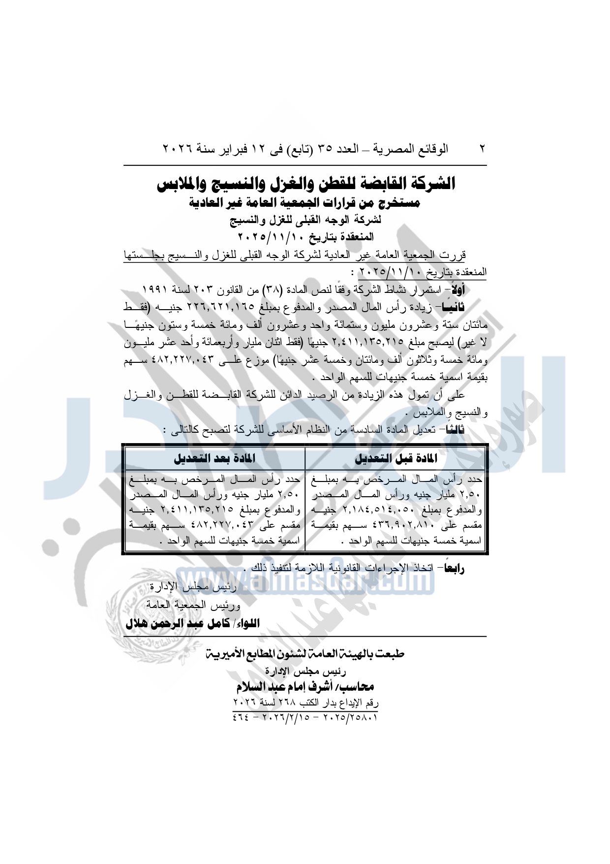 نشرت الوقائع المصرية، في العدد 35 "تابع"، الصادر في 12 فبراير سنة 2026، قرار الشركة القابضة للقطن والغزل والنسيج والملابس، مستخرج من قرارات الجمعية العامة غير العادية، لشركة الوجه القبلي للغزل والنسيج، المنعقدة بتاريخ 10-11-2025.