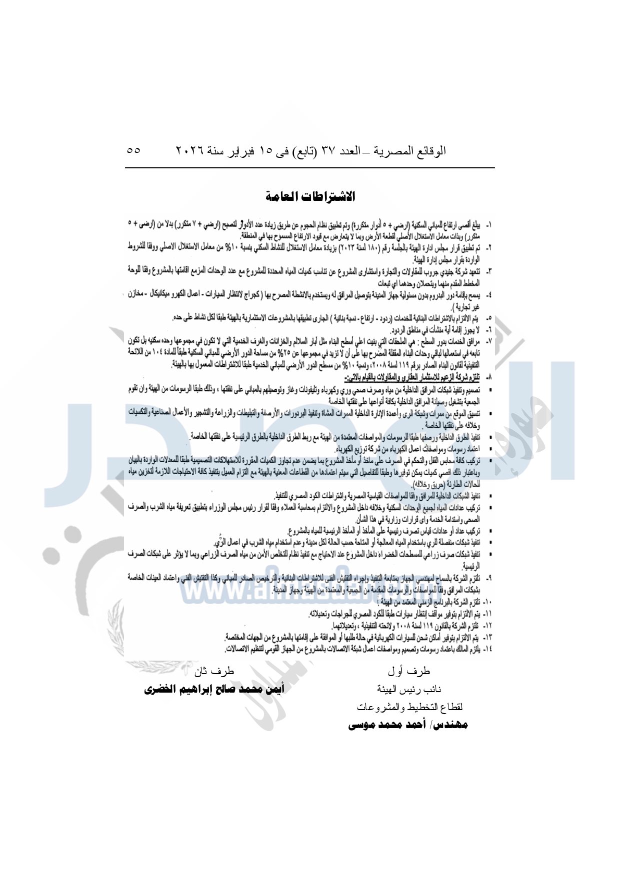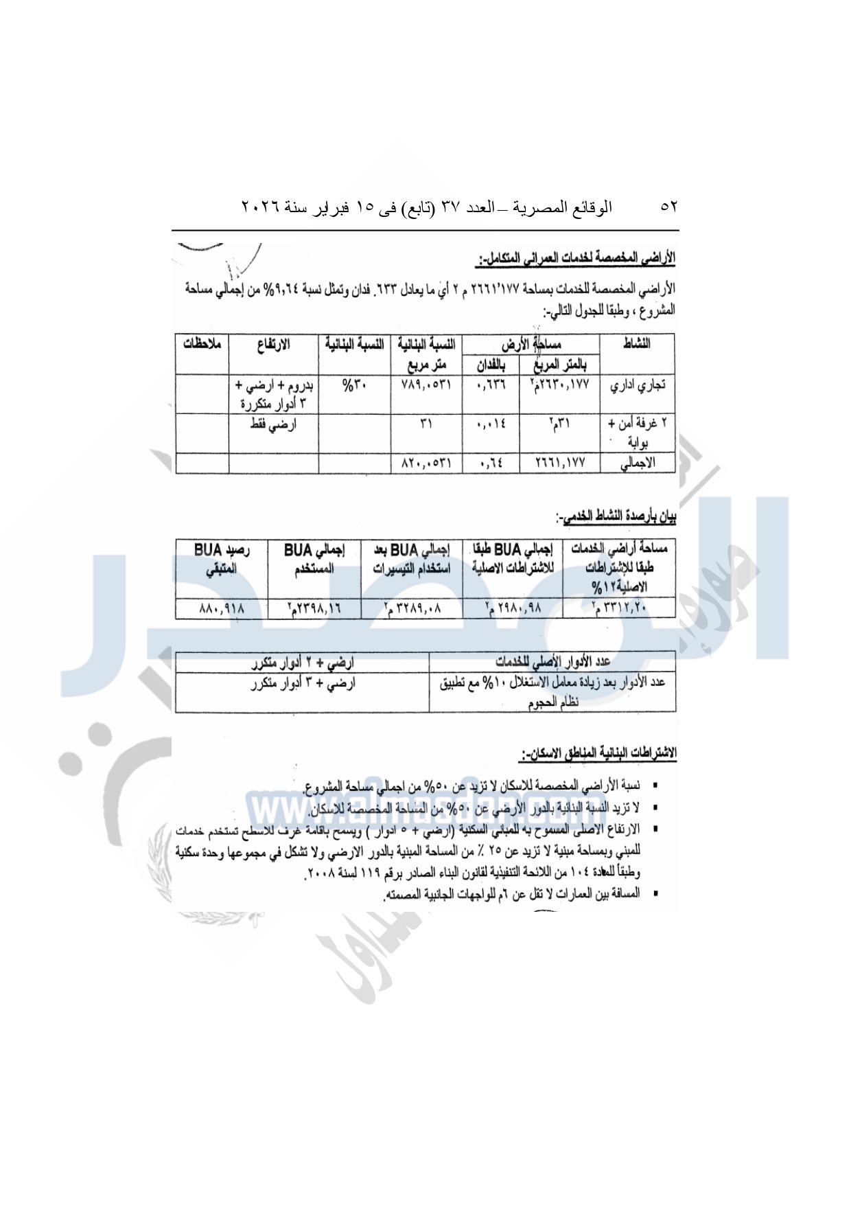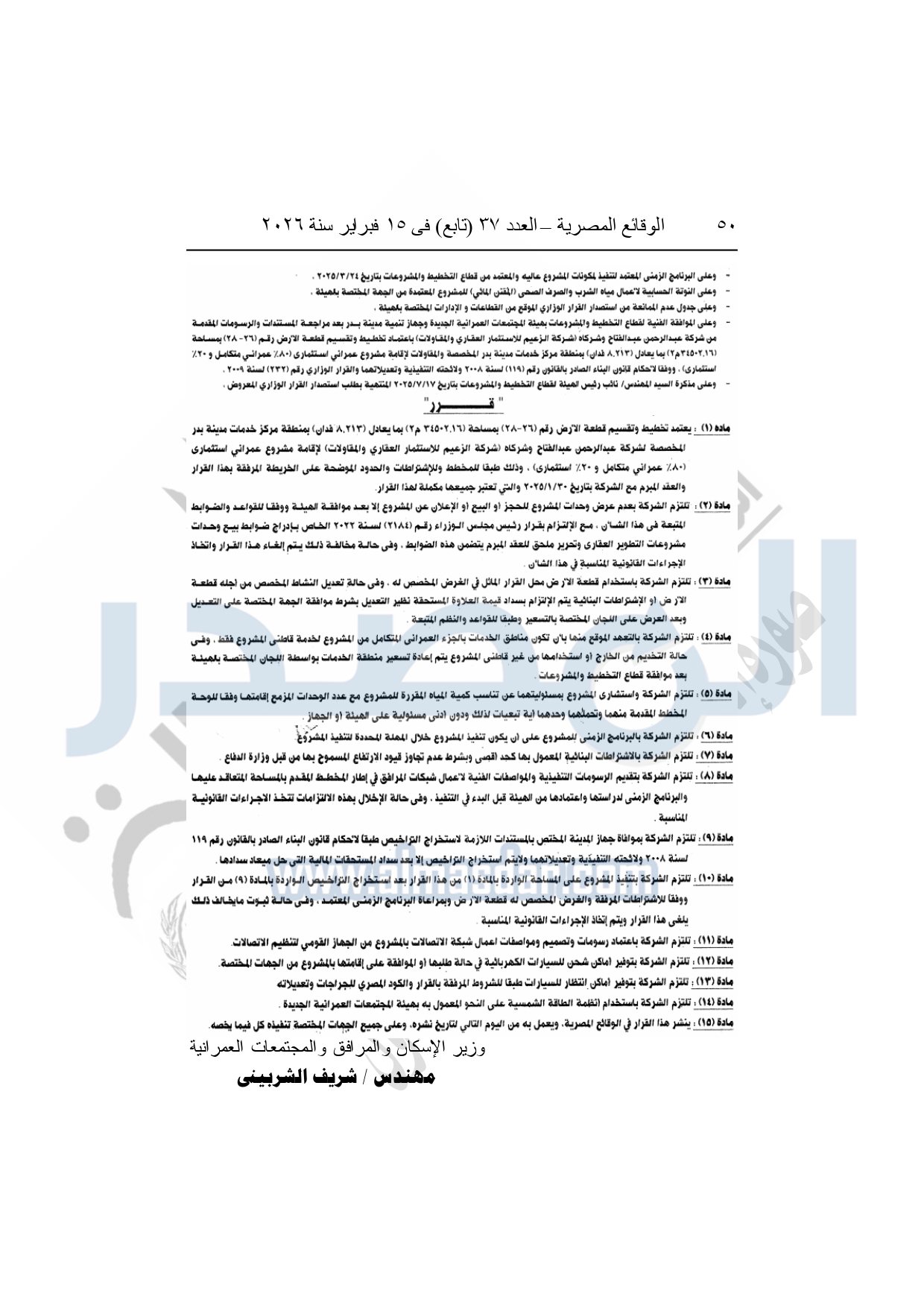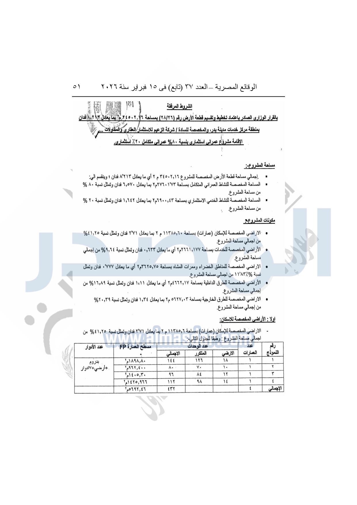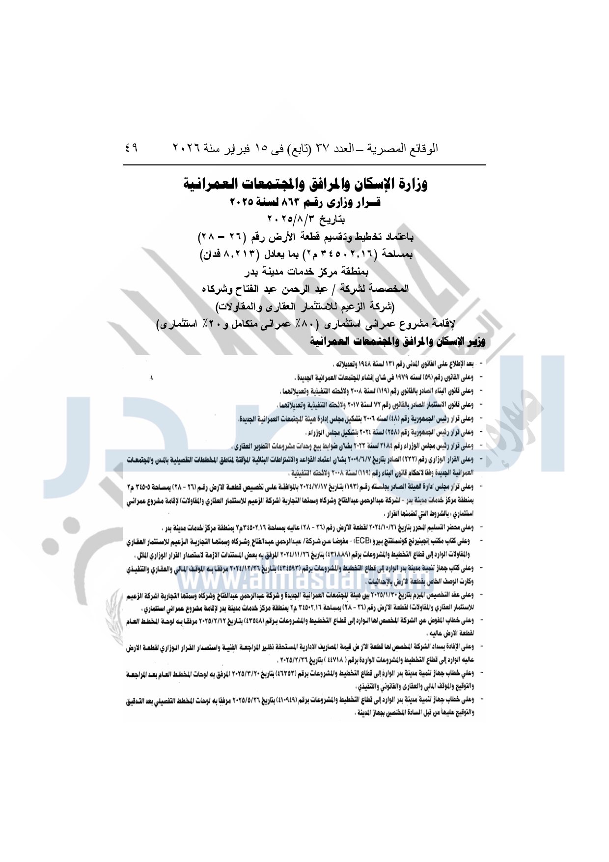 نشرت الوقائع المصرية، في العدد 37 "تابع"، الصادر في 15 فبراير سنة 2026، قرار وزارة الإسكان والمرافق والمجتمعات العمرانية، رقم 863 لسنة 2025 بتاريخ 3-8-2025، بشأن اعتماد تخطيط وتقسيم قطعة أرض بمنطقة مركز خدمات مدينة بدر المخصصة لشركة عبد الرحمن عبد الفتاح وشركاه "شركة الزعيم للاستثمار العقارى والمقاولات" لإقامة مشروع عمراني استثماری "80% عمرانی متکامل و20% استثماری".
