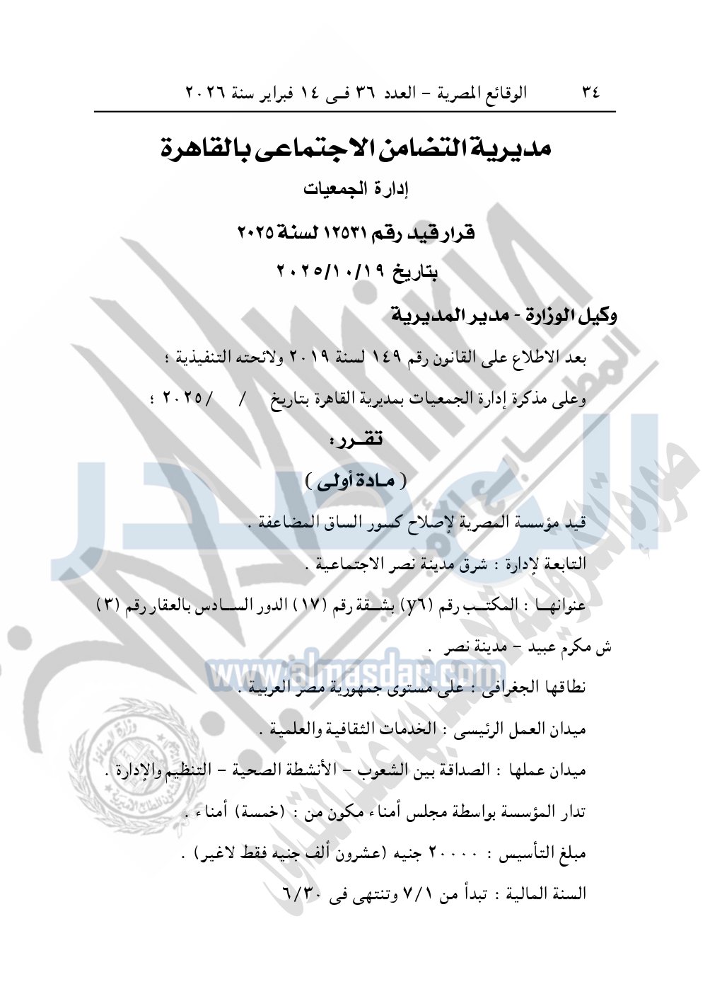 نشرت الوقائع المصرية، في العدد 36، بتاريخ 14 فبراير 2026، قرار مديرية التضامن الاجتماعي بالقاهرة، قيد رقم 12531 لسنة 2025، بتاريخ 19-10-2025، بشأن قيد مؤسسة المصرية لإصلاح كسور الساق المضاعفة.