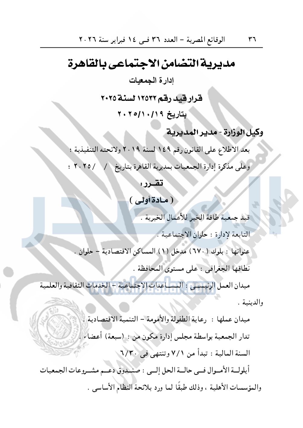 كما نشرت الوقائع المصرية، في العدد 36، بتاريخ 14 فبراير 2026، قرار مديرية التضامن الاجتماعي بالقاهرة، قيد رقم 12532 لسنة 2025، بتاريخ 19-10-2025، بشأن قيد جمعية طاقة الخير للأعمال الخيرية.