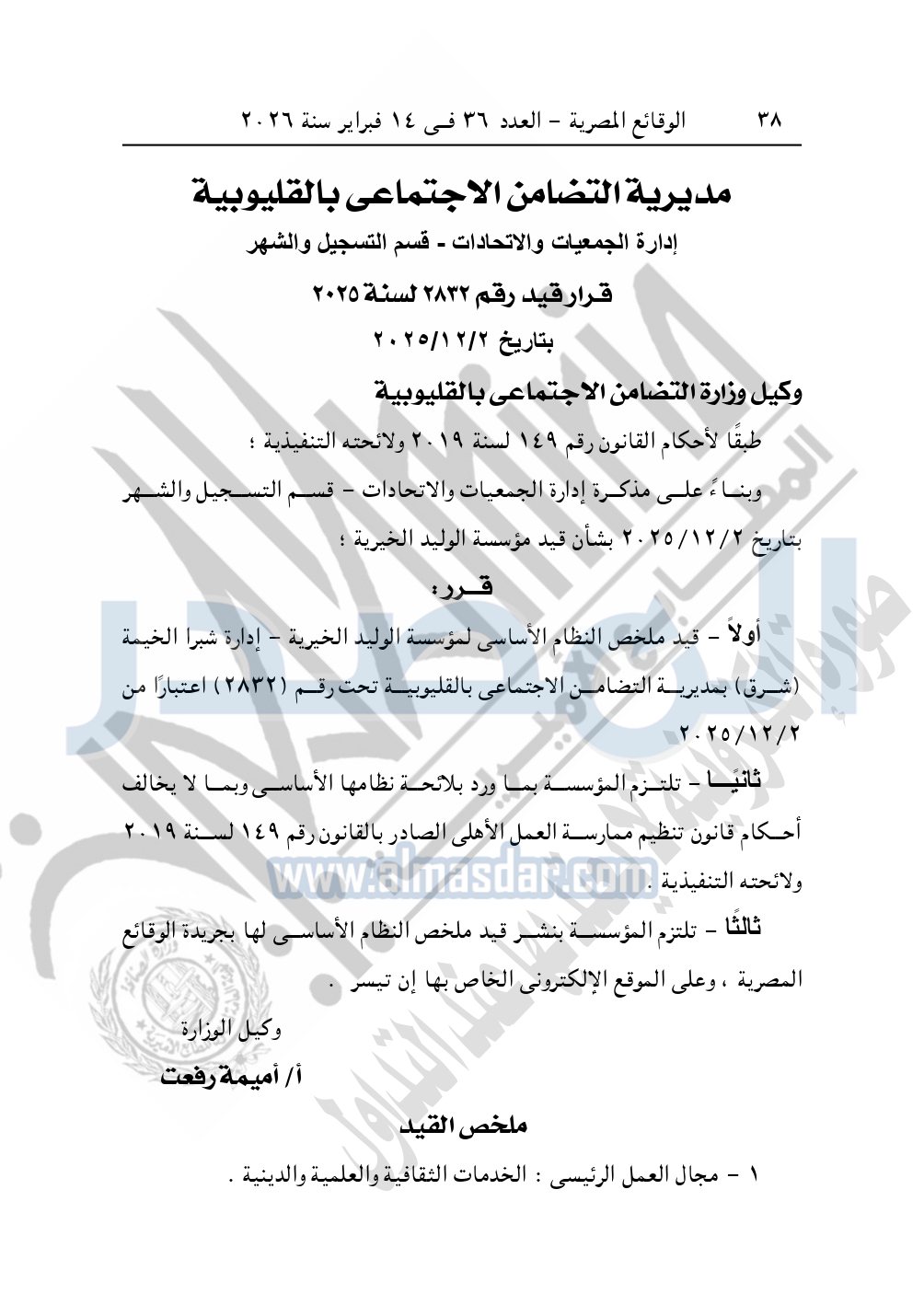 وايضا نشرت الوقائع المصرية، في العدد 36، بتاريخ 14 فبراير 2026، قرار مديرية التضامن الاجتماعي بالقليوبية، قيد رقم 2832 لسنة 2025، بتاريخ 2-12-2025، بشأن قيد مؤسسة الوليد الخيرية.