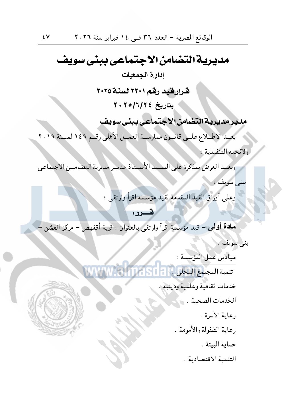 كما نشرت الوقائع المصرية، في العدد 36، بتاريخ 14 فبراير 2026، قرار مديرية التضامن الاجتماعي ببني سويف، قيد رقم 2201 لسنة 2025، بتاريخ 24-6-2025، بشأن قيد مؤسسة أقرأ وارتقى.