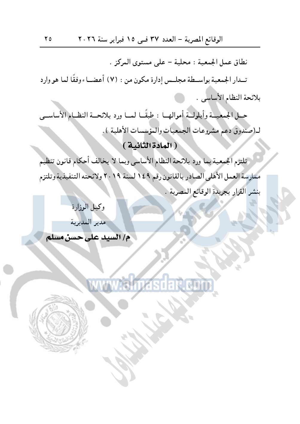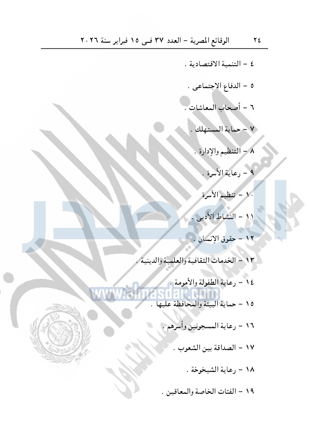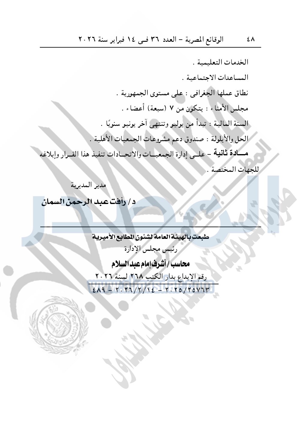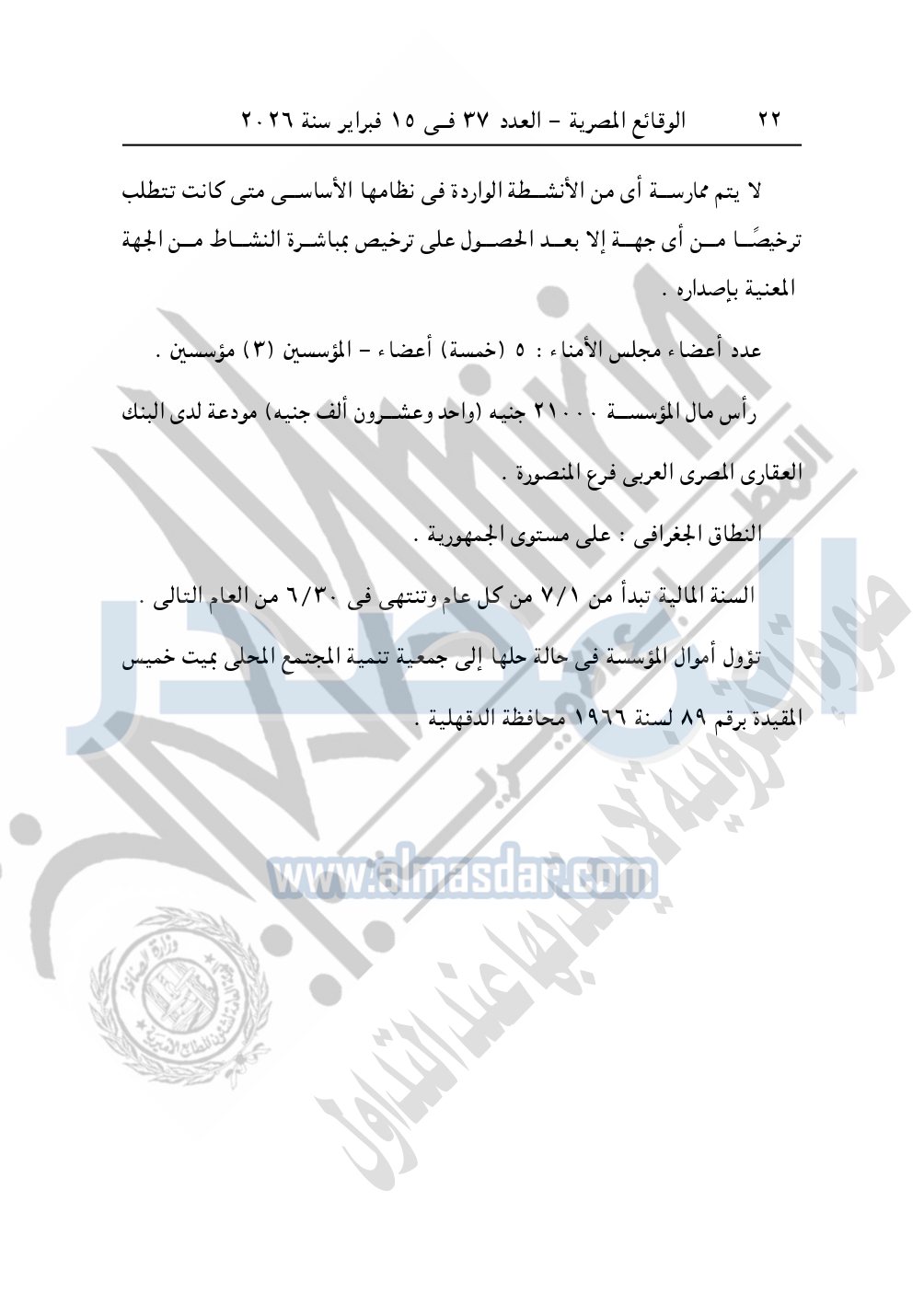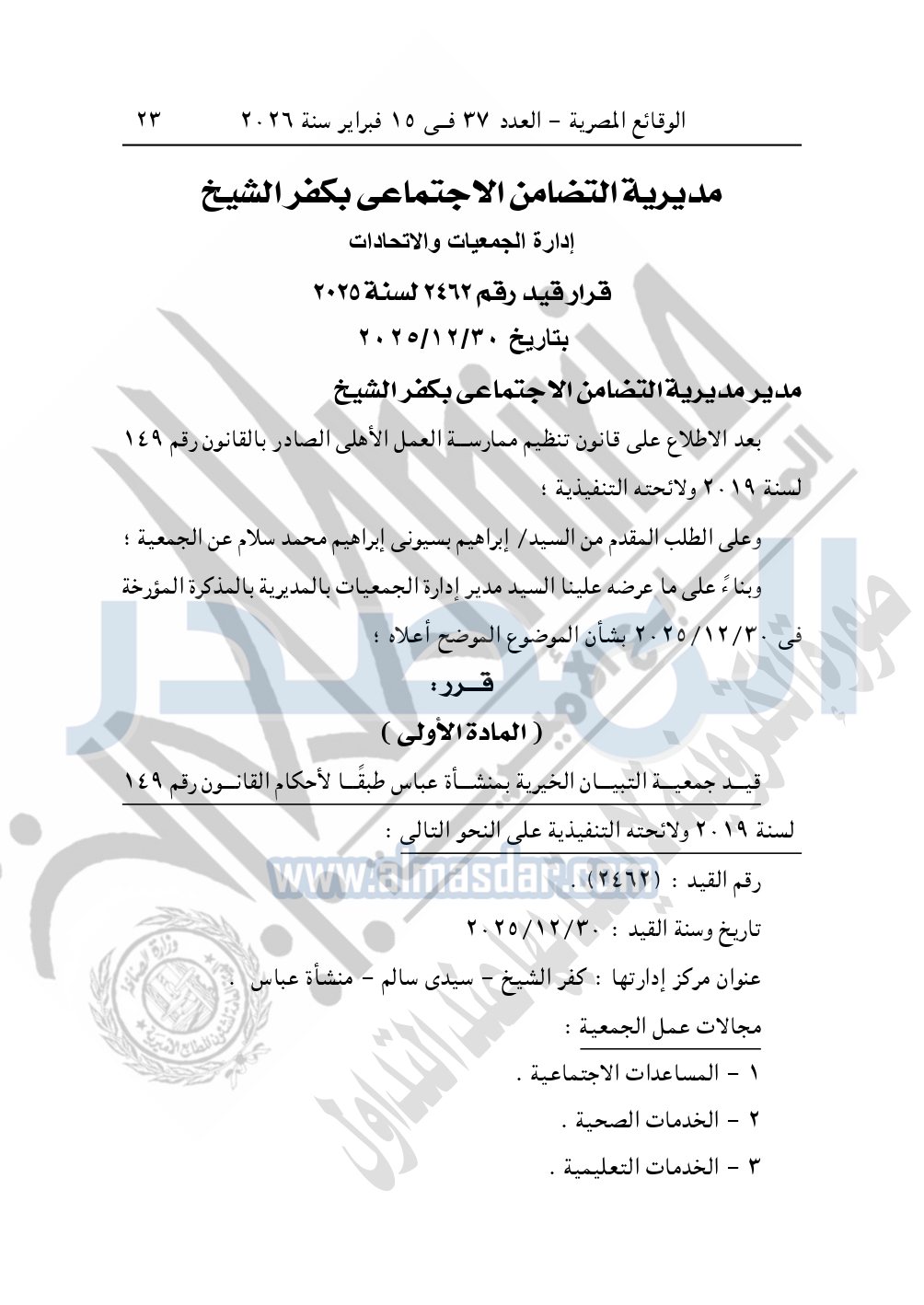 كما نشرت الوقائع المصرية، في العدد 37، بتاريخ 15 فبراير 2026، قرار مديرية التضامن الاجتماعي بكفر الشيخ، قيد رقم 2462، بتاريخ 30-12-2025، بشأن قيد جمعية التبيان الخيرية بمنشأة عباس.