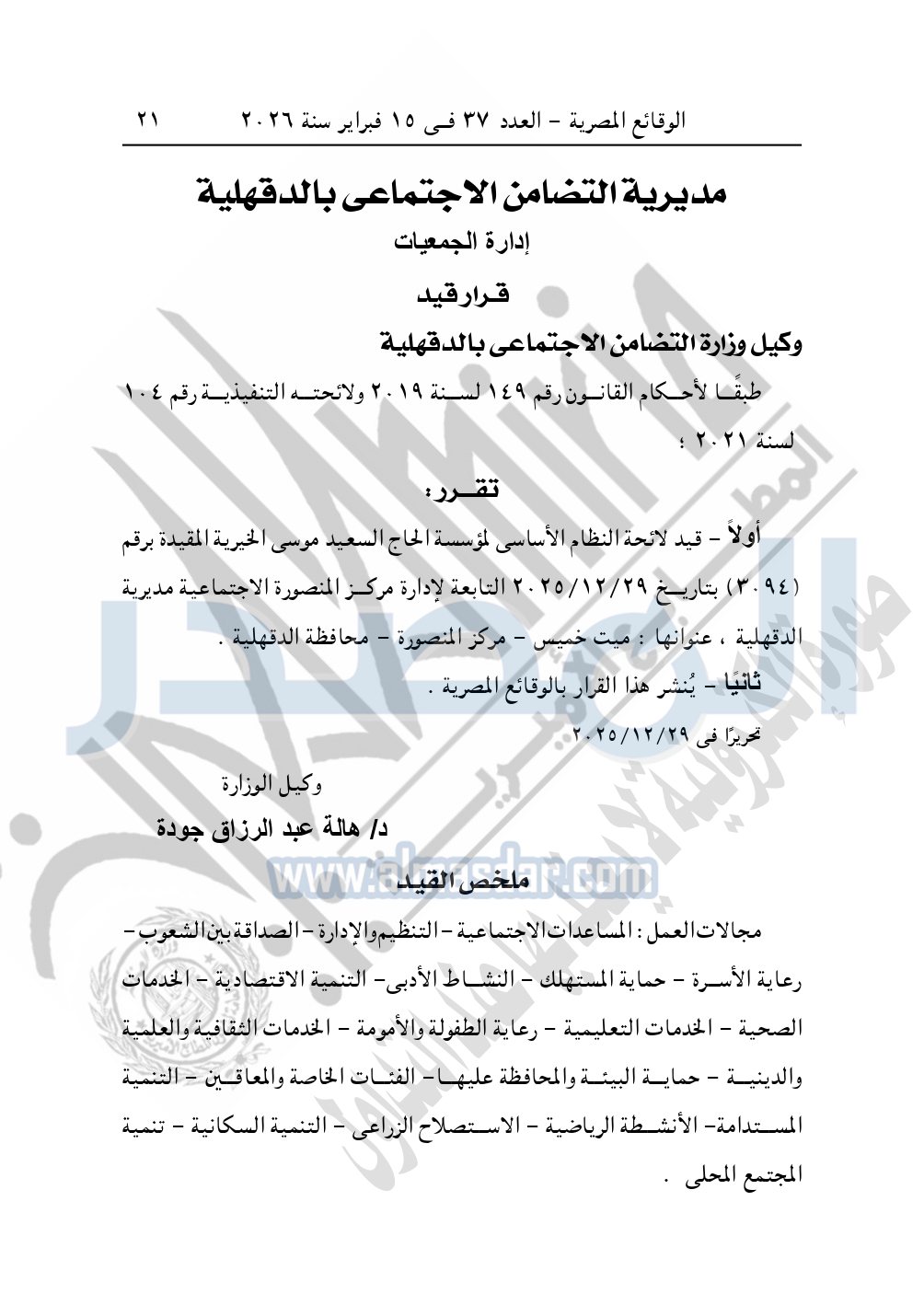 ونشرت الوقائع المصرية، في العدد 37، بتاريخ 15 فبراير 2026، قرار مديرية التضامن الاجتماعي بالدقهلية، قيد رقم 3094، بتاريخ 29-12-2025، بشأن قيد مؤسسة الحاج السعيد موسى الخيرية.