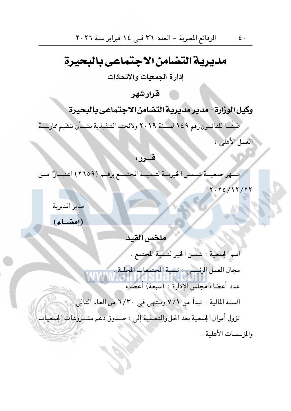 نشرت الوقائع المصرية في العدد 36، الصادر في 14 فبراير سنة 2026، قرار مديرية التضامن الاجتماعى بالبحيرة، قرر شهر رقم 2659، بإشهار جمعية شمس الخيرية لتنمية المجتمع.