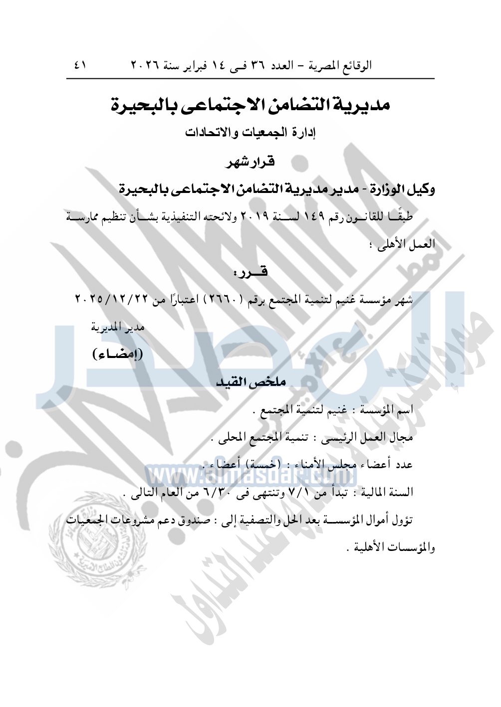 كما نشرت الوقائع المصرية في العدد 36، الصادر في 14 فبراير سنة 2026، قرار مديرية التضامن الاجتماعى بالبحيرة، قرر شهر رقم 2660، بإشهار مؤسسة غنيم لتنمية المجتمع.