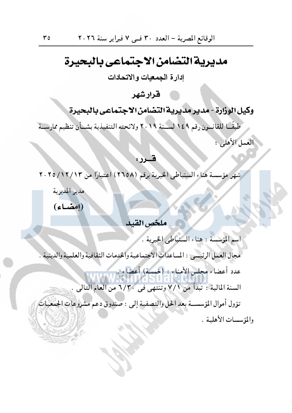 وأيضا نشرت الوقائع المصرية في العدد 30، الصادر في 7 فبراير سنة 2026، قرار مديرية التضامن الاجتماعى بالبحيرة، قرر شهر رقم 2658، بإشهار مؤسسة هناء السنباطي الخيرية.