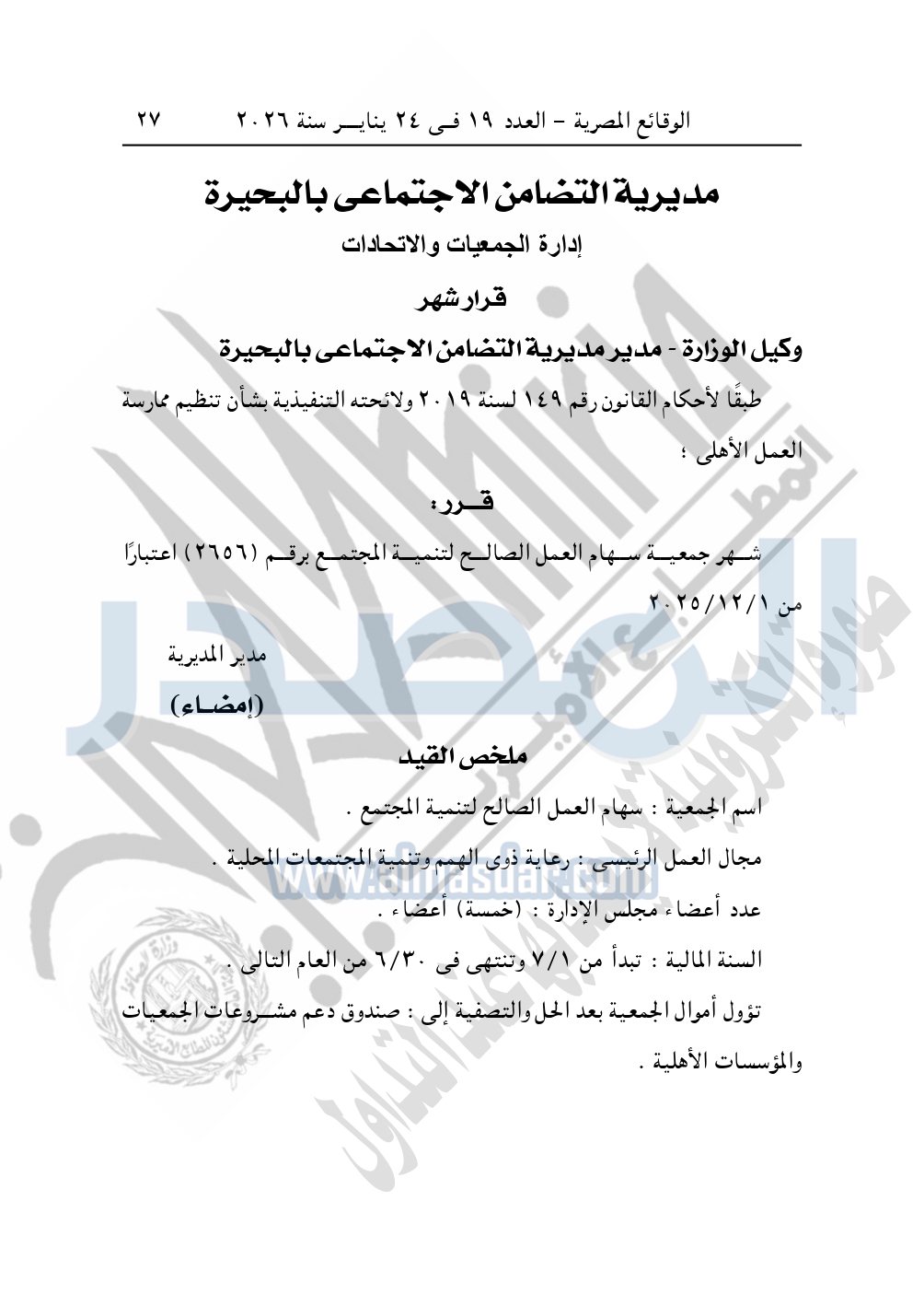 ونشرت الوقائع المصرية في العدد 19، الصادر في 24 يناير سنة 2026، قرار مديرية التضامن الاجتماعى بالبحيرة، قرر شهر رقم 2656، بإشهار جمعية سهام العمل الصالح لتنمية المجتمع.
