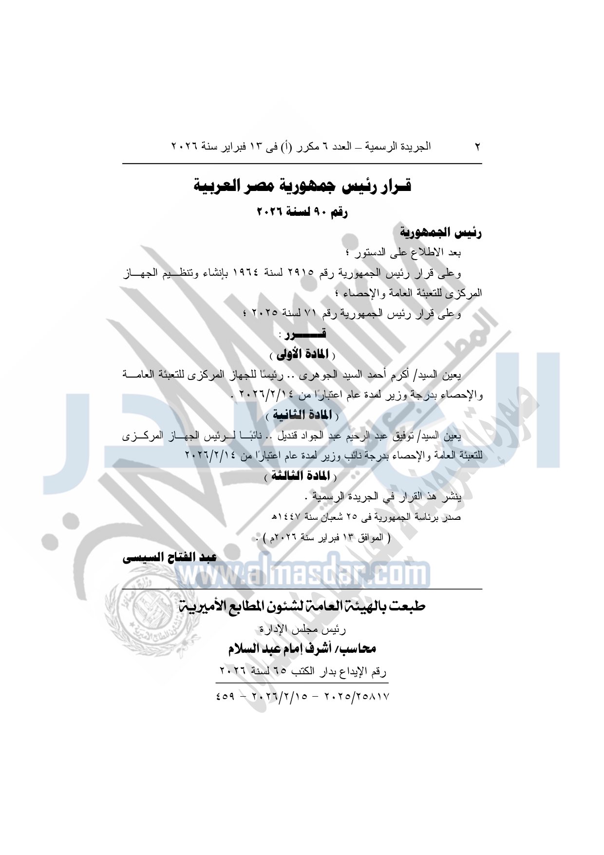 نشرت الجريدة الرسمية، في العدد 6 مكرر "أ"، الصادر في 13 فبراير سنة 2026، قرار رئيس جمهورية مصر العربية، رقم 90 لسنة 2026، بشأن تعيين أكرم أحمد السيد الجوهرى - رئيسًا للجهاز المركزى للتعبئة العامة والإحصاء.
