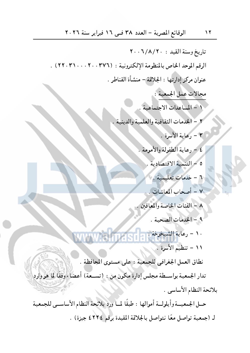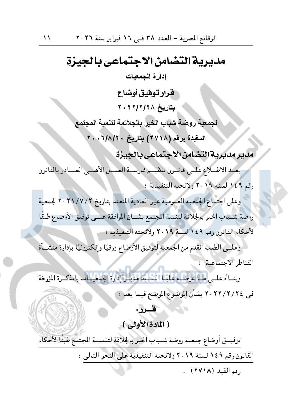 نشرت الوقائع المصرية في العدد 38، بتاريخ 16 فبراير 2026، قرار مديرية التضامن الاجتماعي بالجيزة، بشأن توفيق أوضاع جمعية روضة شباب الخير بالجلاتمة لتنمية المجتمع، المقيدة برقم "2718" بتاريخ 20-8-2006.