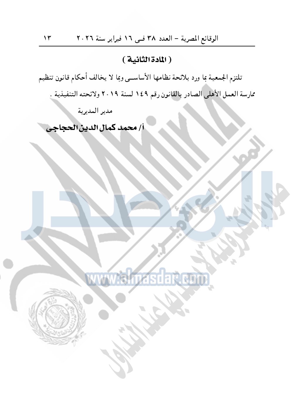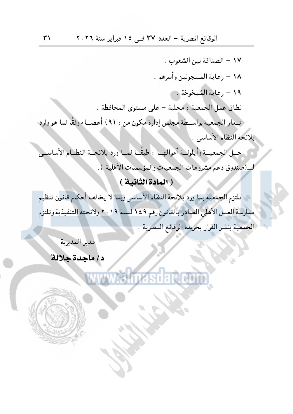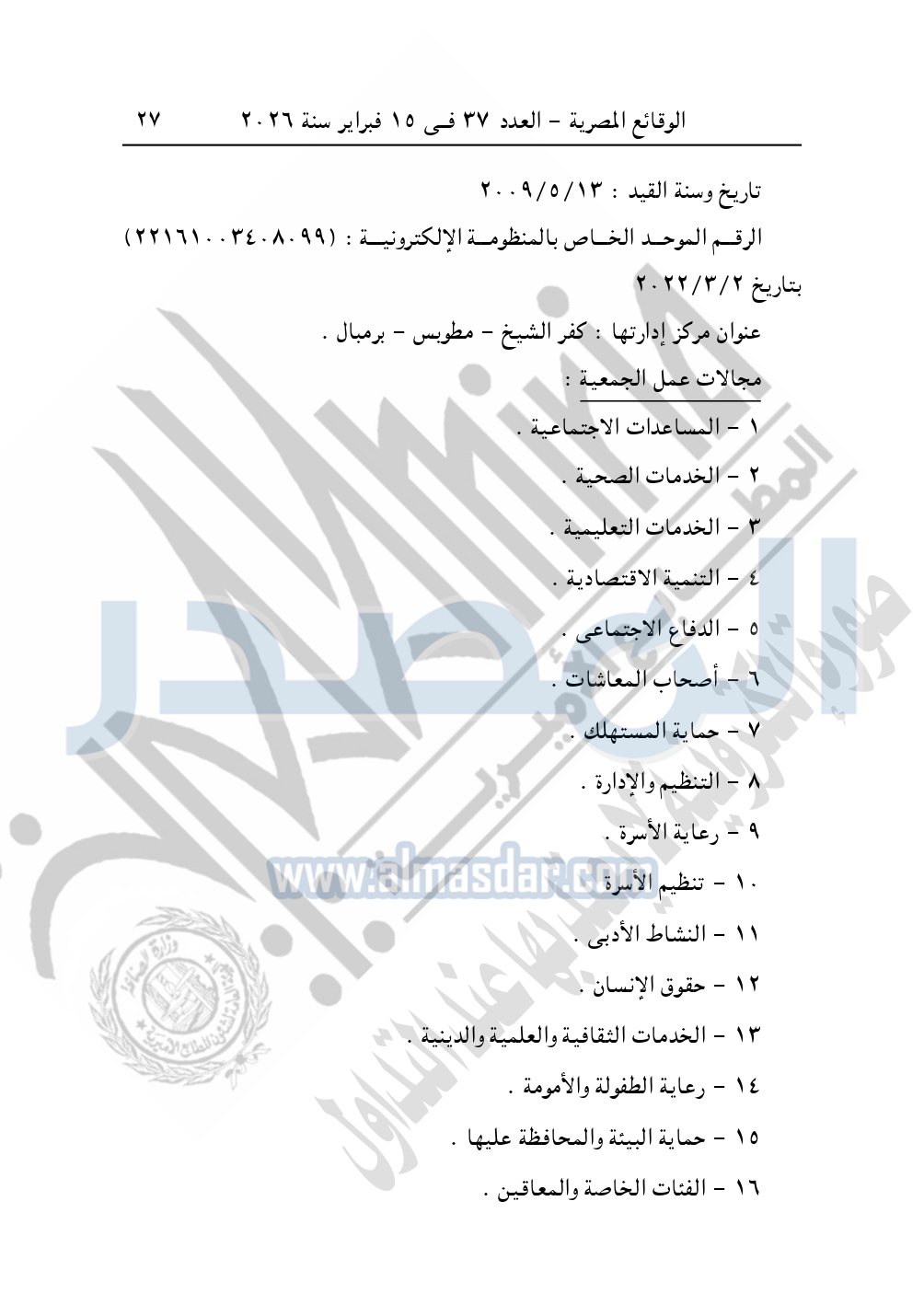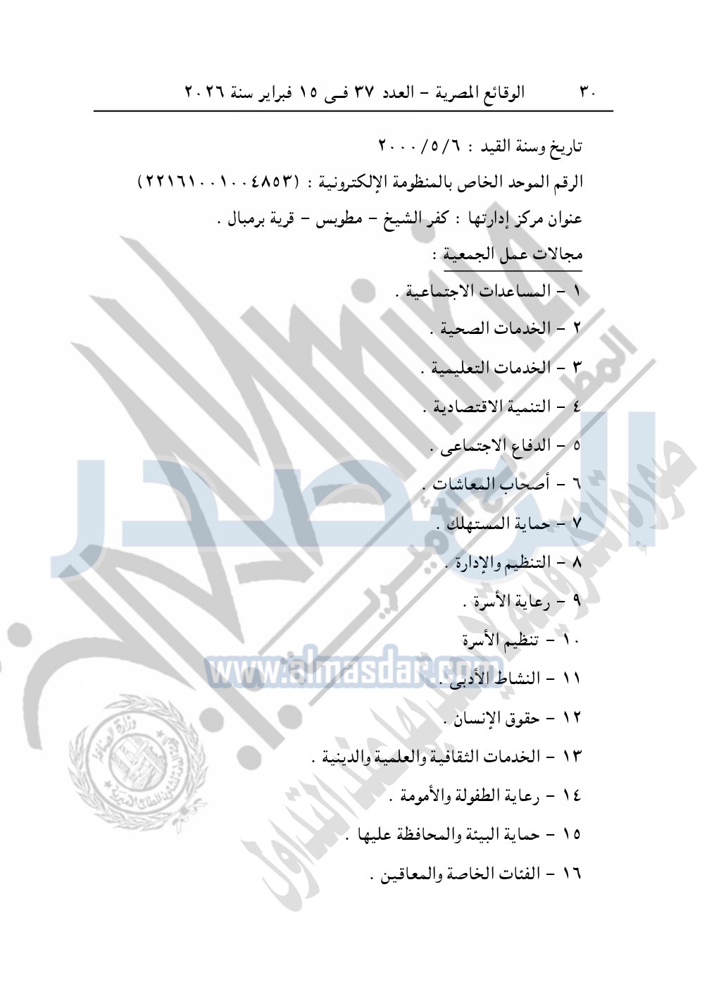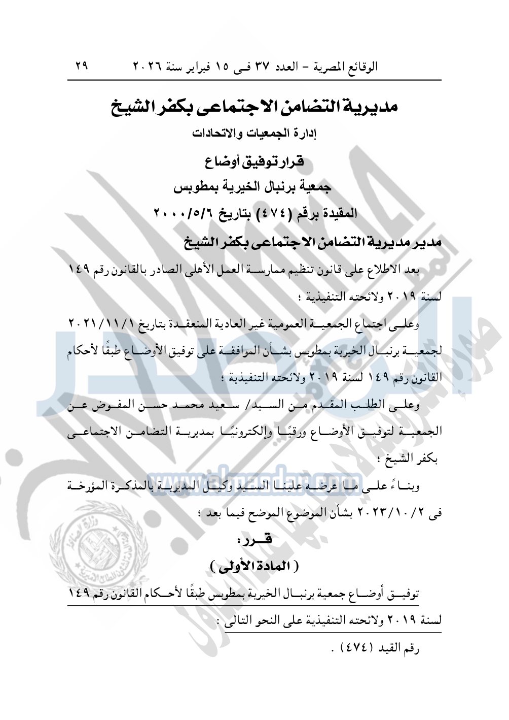 وأيضا نشرت الوقائع المصرية في العدد 37، بتاريخ 15 فبراير 2026، قرار مديرية التضامن الاجتماعي بكفر الشيخ، بشأن توفيق أوضاع جمعية برنبال الخيرية بمطوبس، المقيدة برقم "474" بتاريخ 6-5-2000.