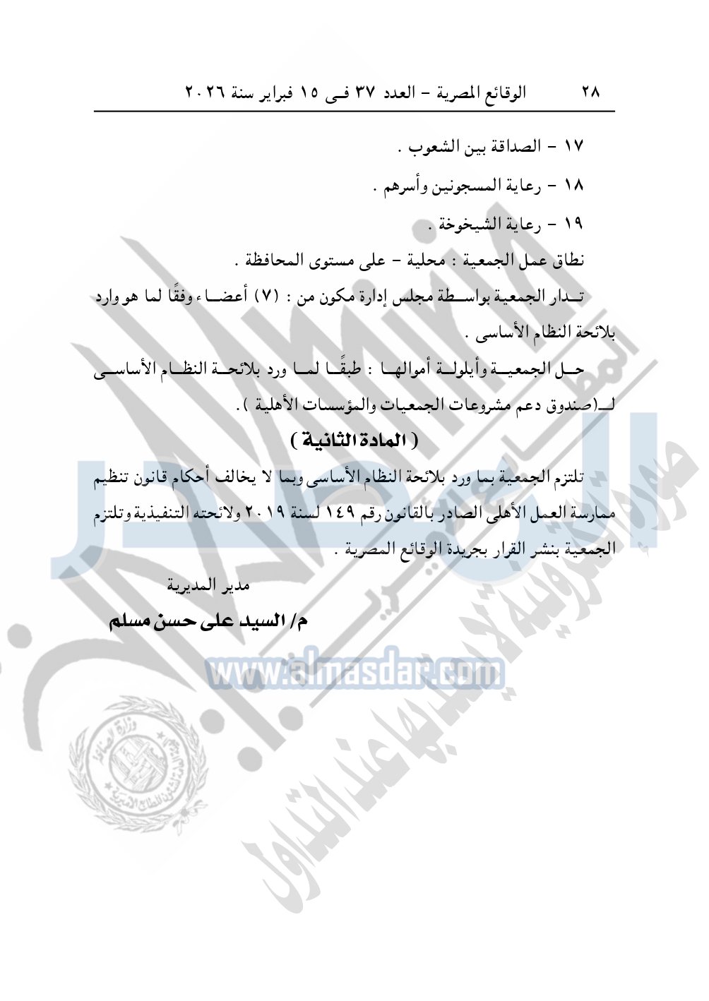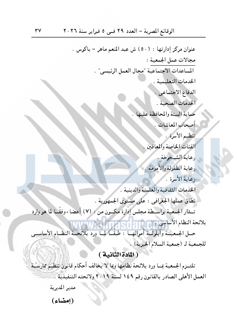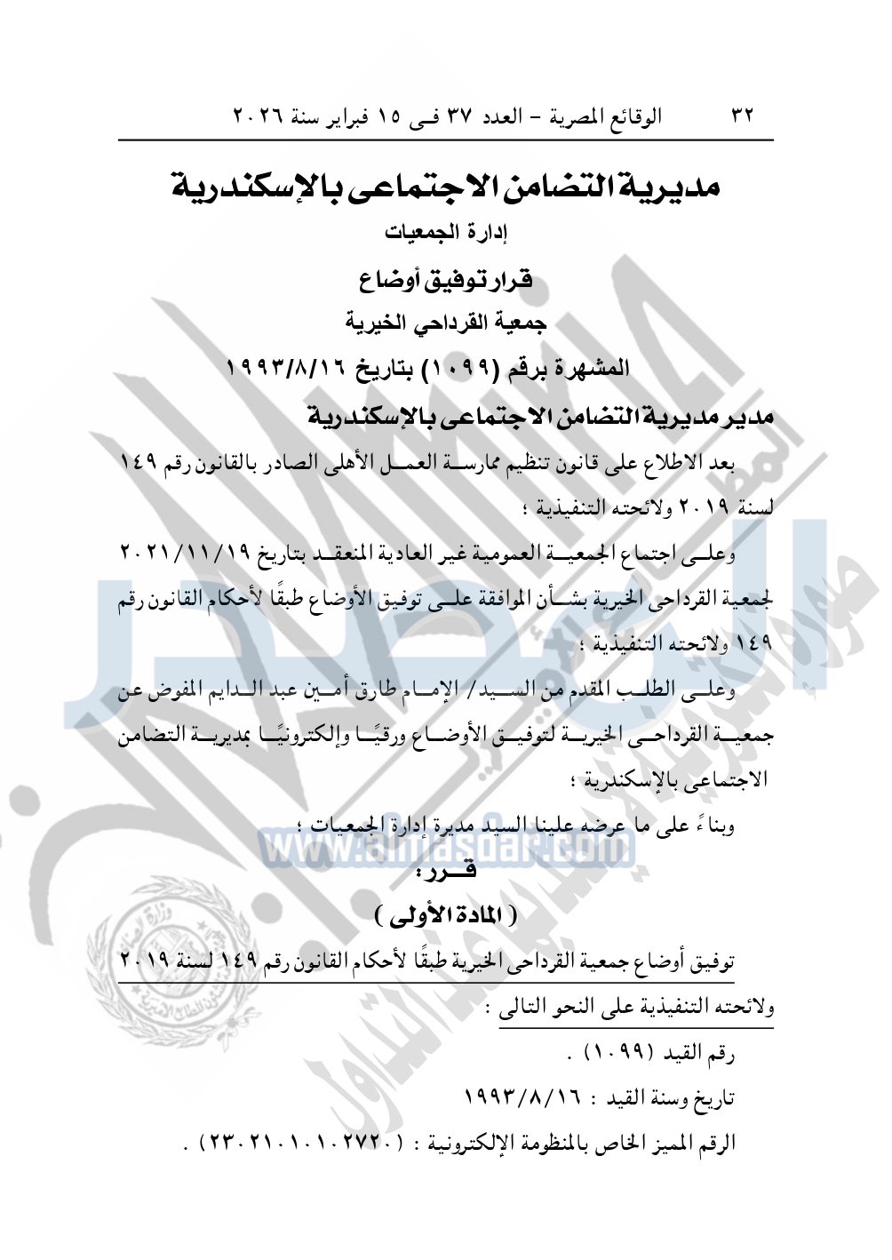 كما نشرت الوقائع المصرية في العدد 37، بتاريخ 15 فبراير 2026، قرار مديرية التضامن الاجتماعي بالإسكندرية، بشأن توفيق أوضاع جمعية القرداحي الخيرية، المقيدة برقم "1099" بتاريخ 16-8-1993.