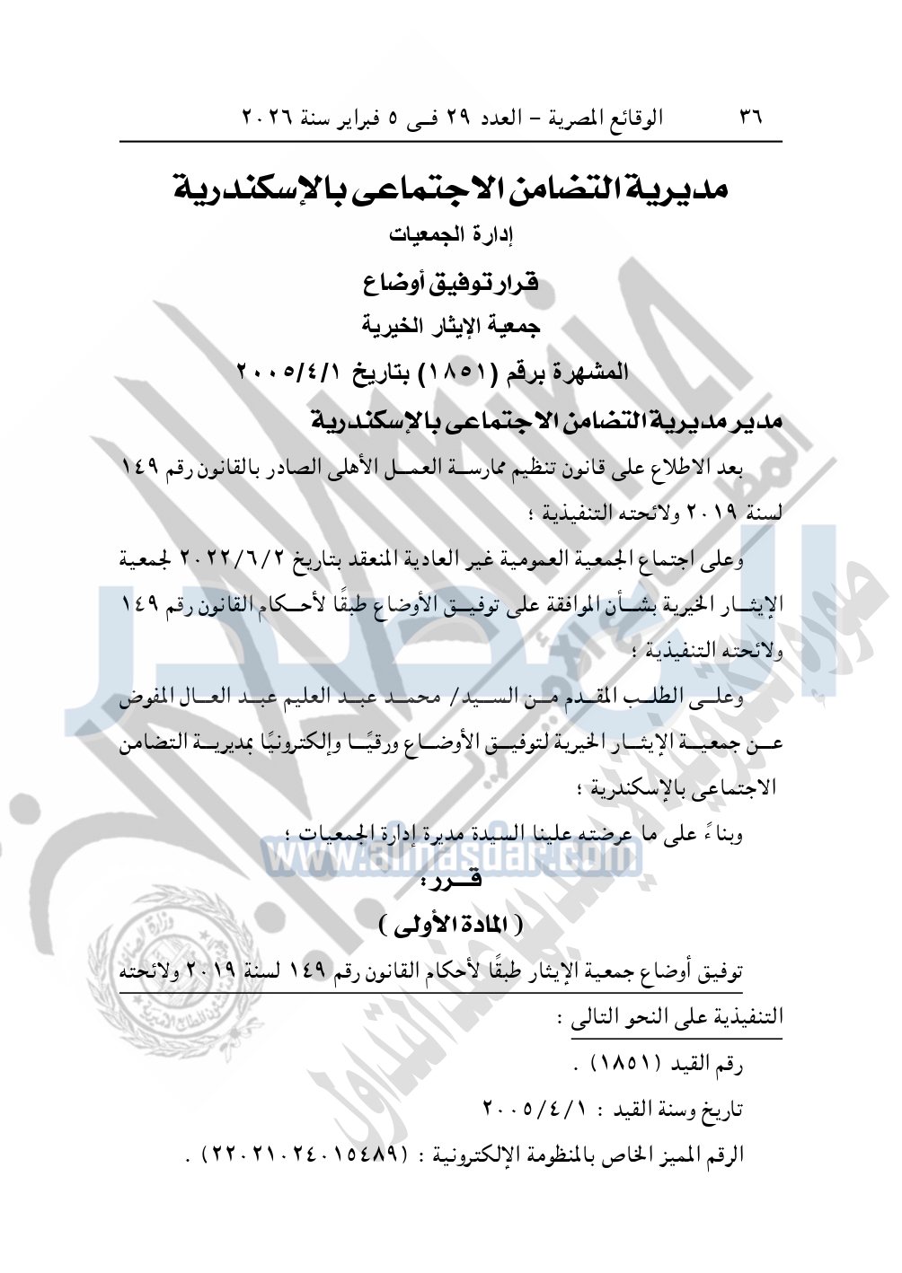 ونشرت الوقائع المصرية في العدد 29، بتاريخ 5 فبراير 2026، قرار مديرية التضامن الاجتماعي بالإسكندرية، بشأن توفيق أوضاع جمعية الإيثار الخيرية، المقيدة برقم "1851" بتاريخ 1-4-2005.