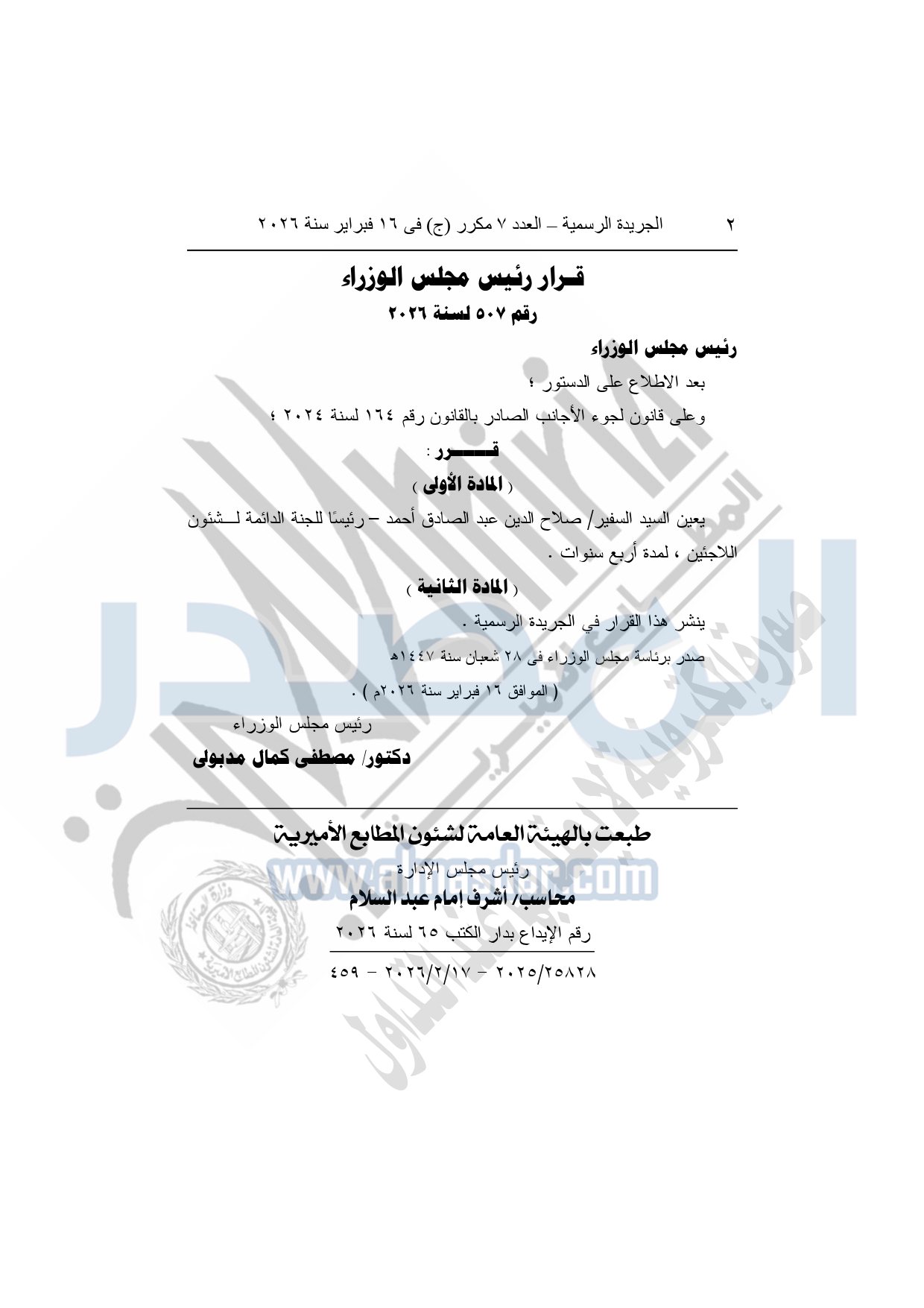 نشرت الجريدة الرسمية في العدد 7 مكرر "ج" الصادر في 16 فبراير سنة 2026، قرار رئيس مجلس الوزراء رقم 507 لسنة 2026، بشأن تعيين السفير صلاح الدين عبد الصادق أحمد رئيسًا للجنة الدائمة لشئون اللاجئين لمدة أربع سنوات.