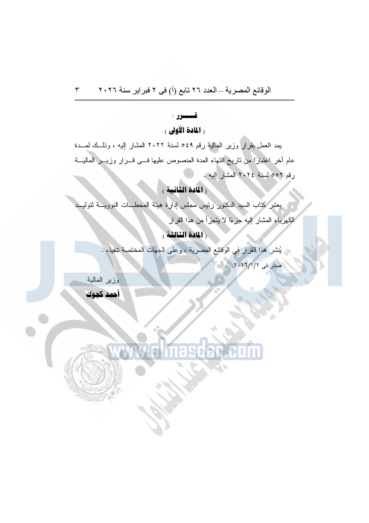 وعلى كتاب السيد الدكتور رئيس مجلس إدارة هيئة المحطات النووية لتوليد الكهرباء رقم 6502/1 بتاريخ 10-12-2025 بطلب تجديد العمل بقرار وزير المالية رقم 549 لسنة 2022 المشار إليه لمدة عام آخر، وذلك استكمالًا للإجراءات اللازمة والضرورية نحو الإفراج عن مشحونات المشروع النووي بالضبعة دون تأخير في المخطط الزمني العام للمشروع؛ وبناءً على ما عرضته مصلحة الجمارك.