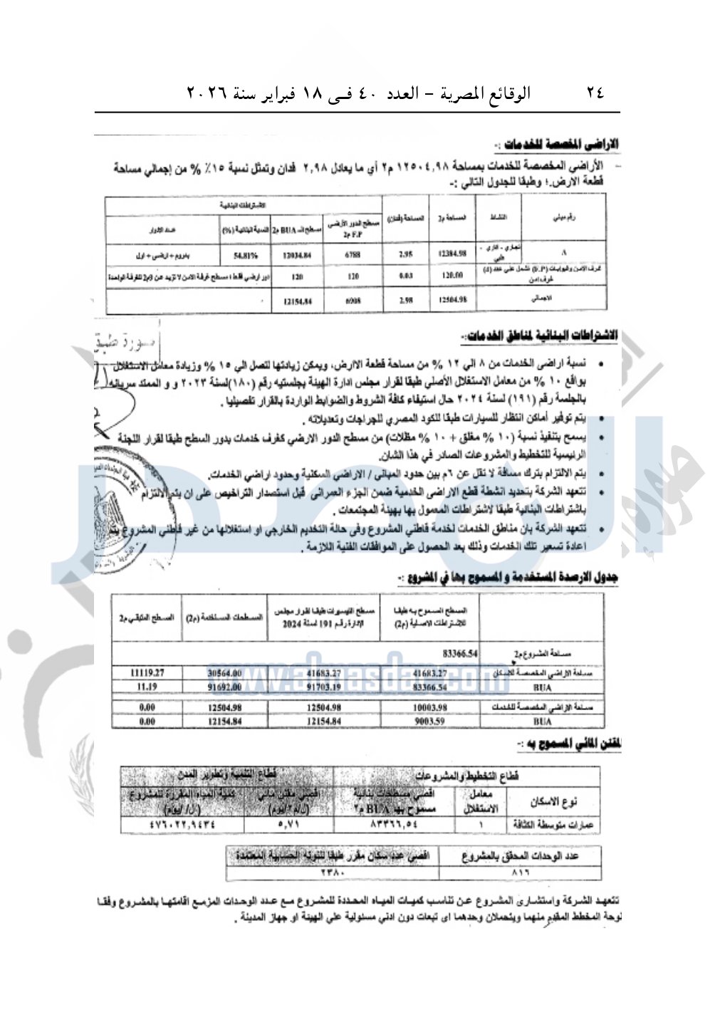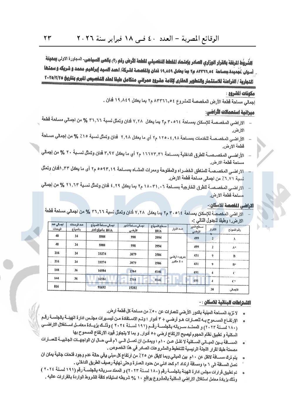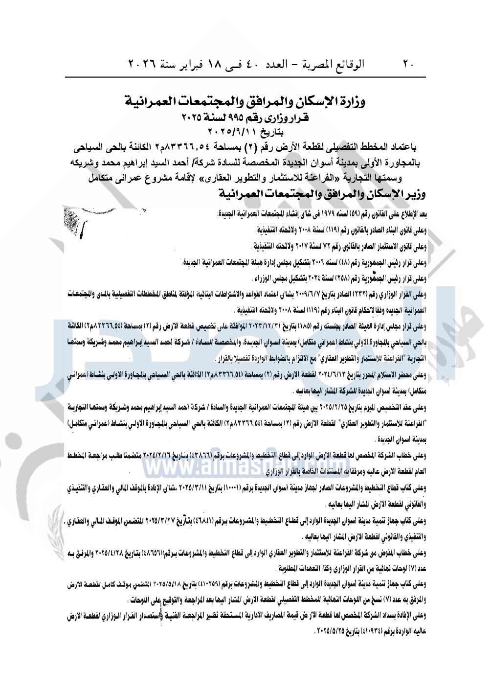 نشرت الوقائع المصرية، في العدد 40، الصادر في 18 فبراير سنة 2026، قرار وزارة الإسكان والمرافق والمجتمعات العمرانية، رقم 995 لسنة 2025، بتاريخ 11-9-2025، بشأن اعتماد المخطط التفصيلي لقطعة الأرض رقم "2" بمساحة 83366.54م2 الكائنة بالحي السياحي بالمجاورة الأولى بمدينة أسوان الجديدة المخصصة لشركة أحمد السيد إبراهيم محمد وشريكه وسمتها التجارية «الفراعنة للاستثمار والتطوير العقارى» لإقامة مشروع عمراني متكامل.