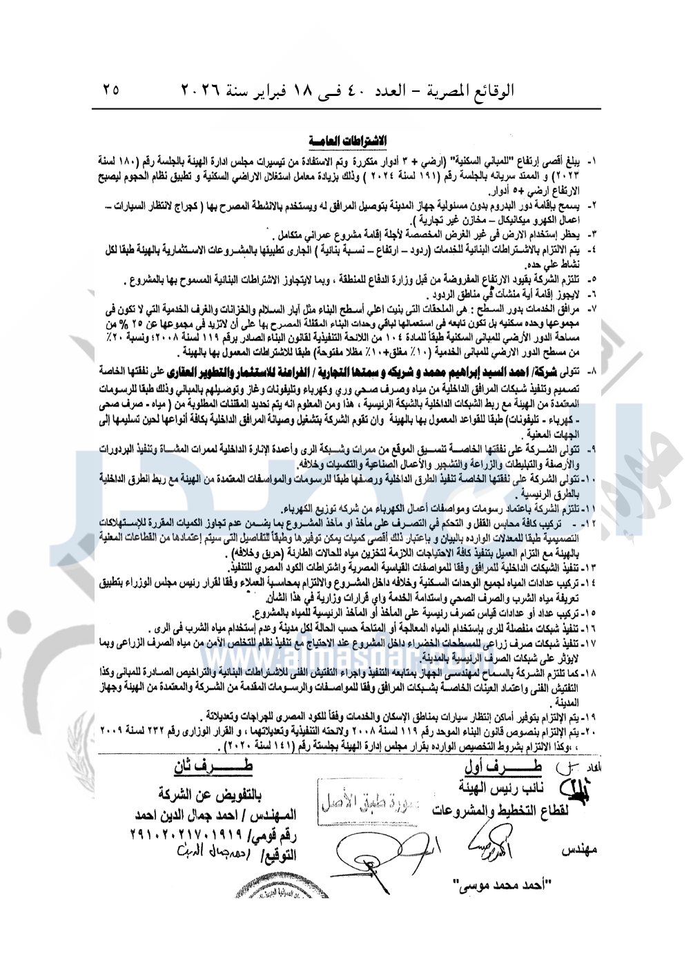 يعتمد المخطط التفصيلي لقطعة الأرض رقم "2" بمساحة 83366.54م2 الكائنة بالحي السياحي بالمجاورة الأولى بمدينة أسوان الجديدة المخصصة لشركة أحمد السيد إبراهيم محمد وشريكه وسمتها التجارية «الفراعنة للاستثمار والتطوير العقارى» لإقامة مشروع عمراني متكامل، وذلك طبقا للإشتراطات والمخطط والحدود الموضحة على الخريطة المرفقة بهذا القرار والعقد المبرم مع الشركة بتاريخ 25-2-2025 والتي تعتبر جميعها مكملة لهذا القرار.