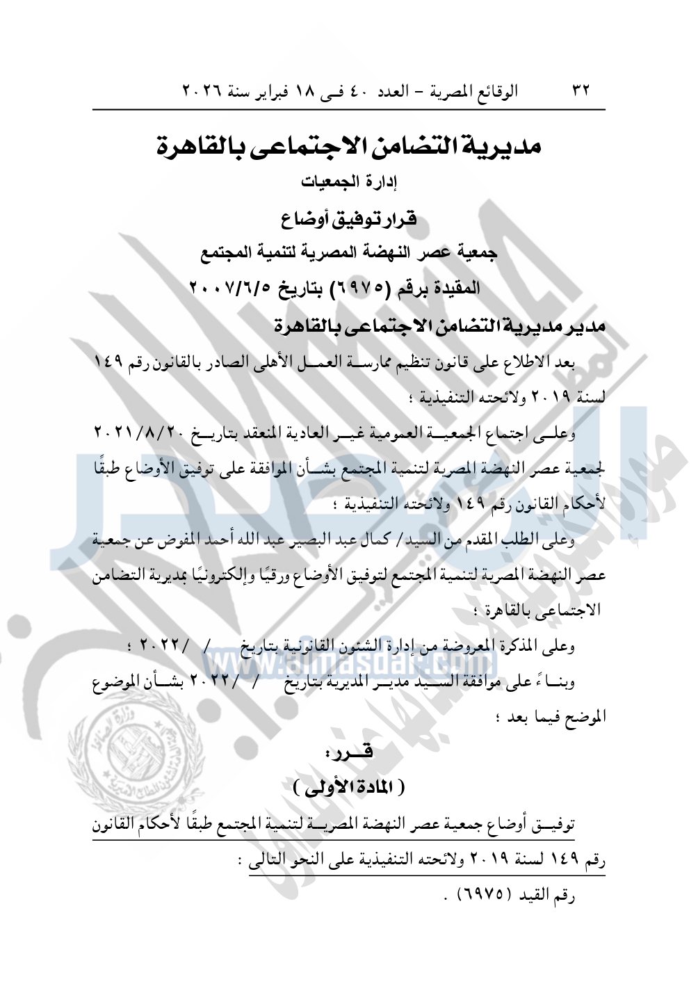 نشرت الوقائع المصرية في العدد 40، بتاريخ 18 فبراير 2026، قرار مديرية التضامن الاجتماعي بالقاهرة، بشأن توفيق أوضاع جمعية عصر النهضة المصرية لتنمية المجتمع، المقيدة برقم "6975" بتاريخ 5-6-2007.