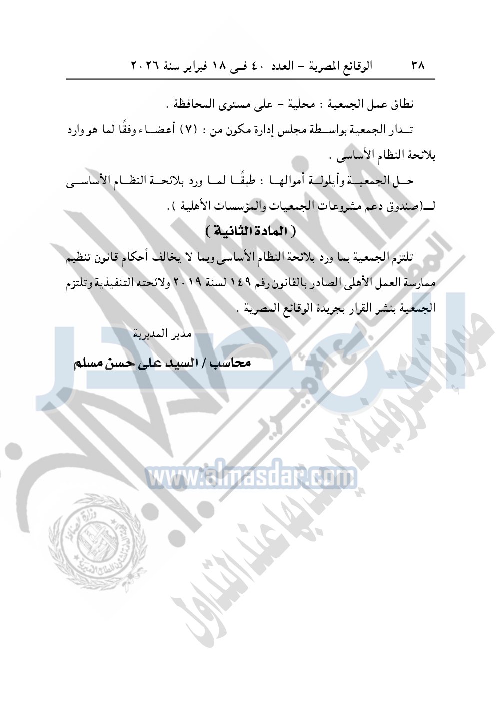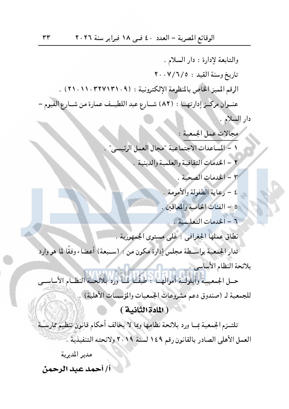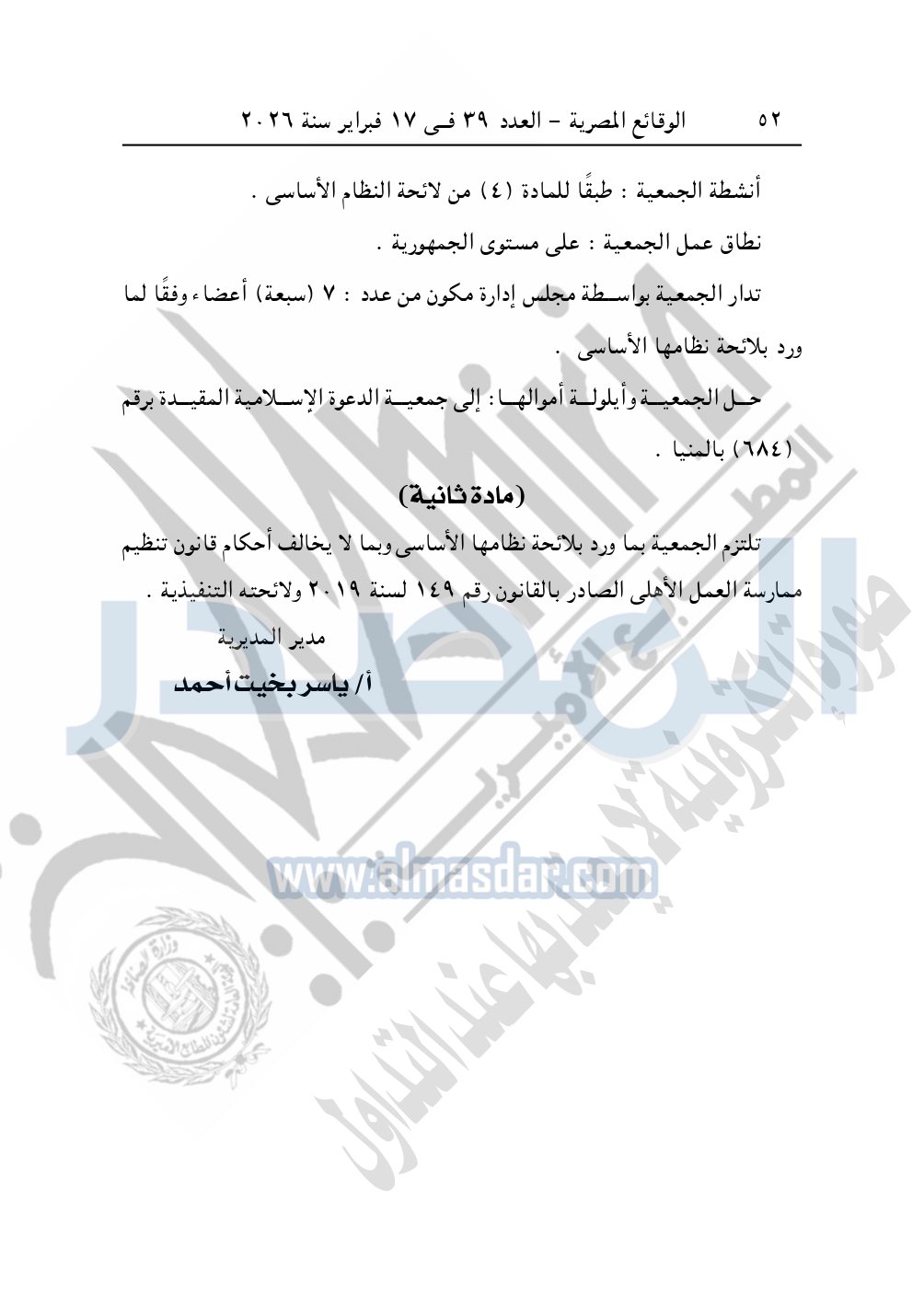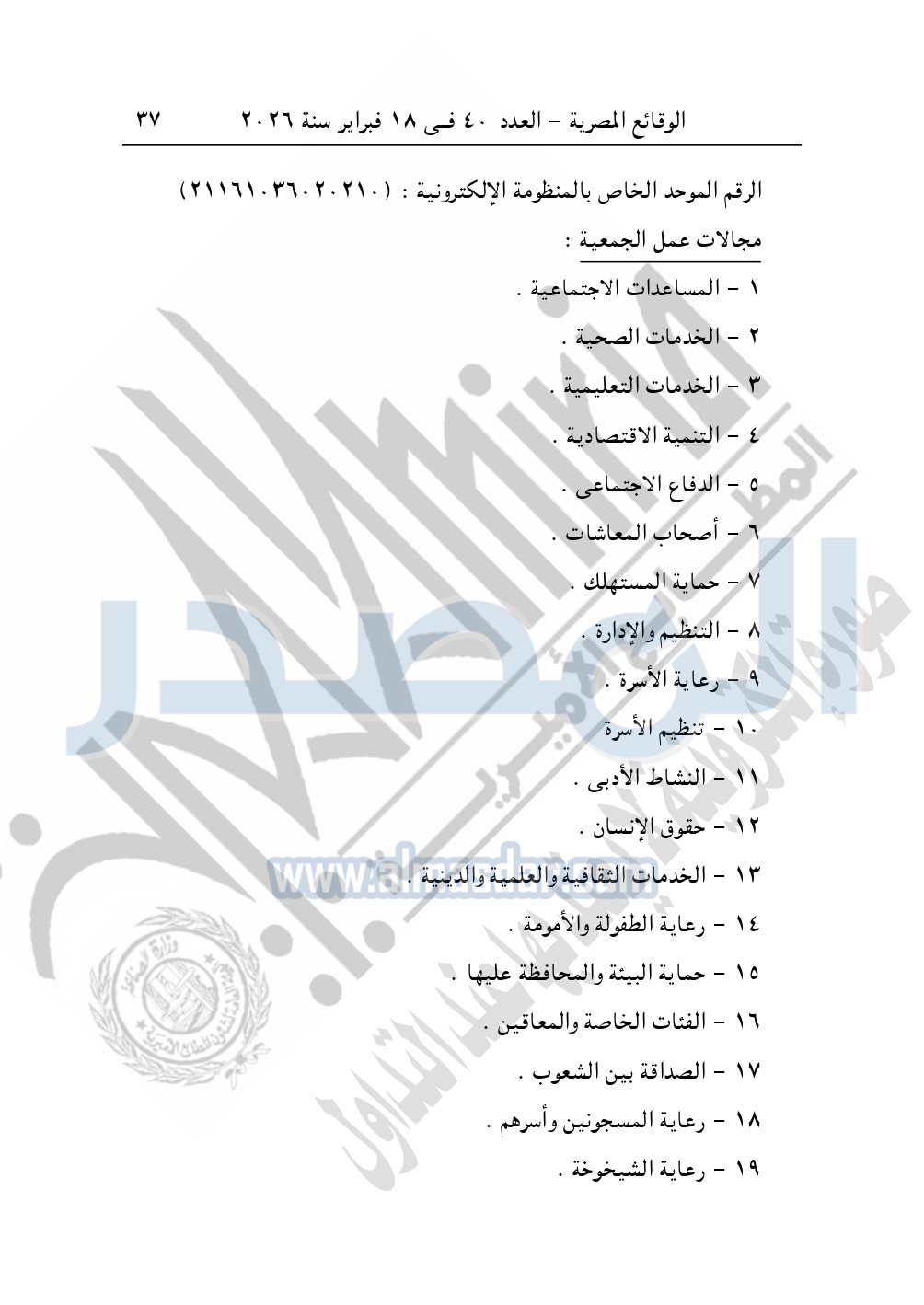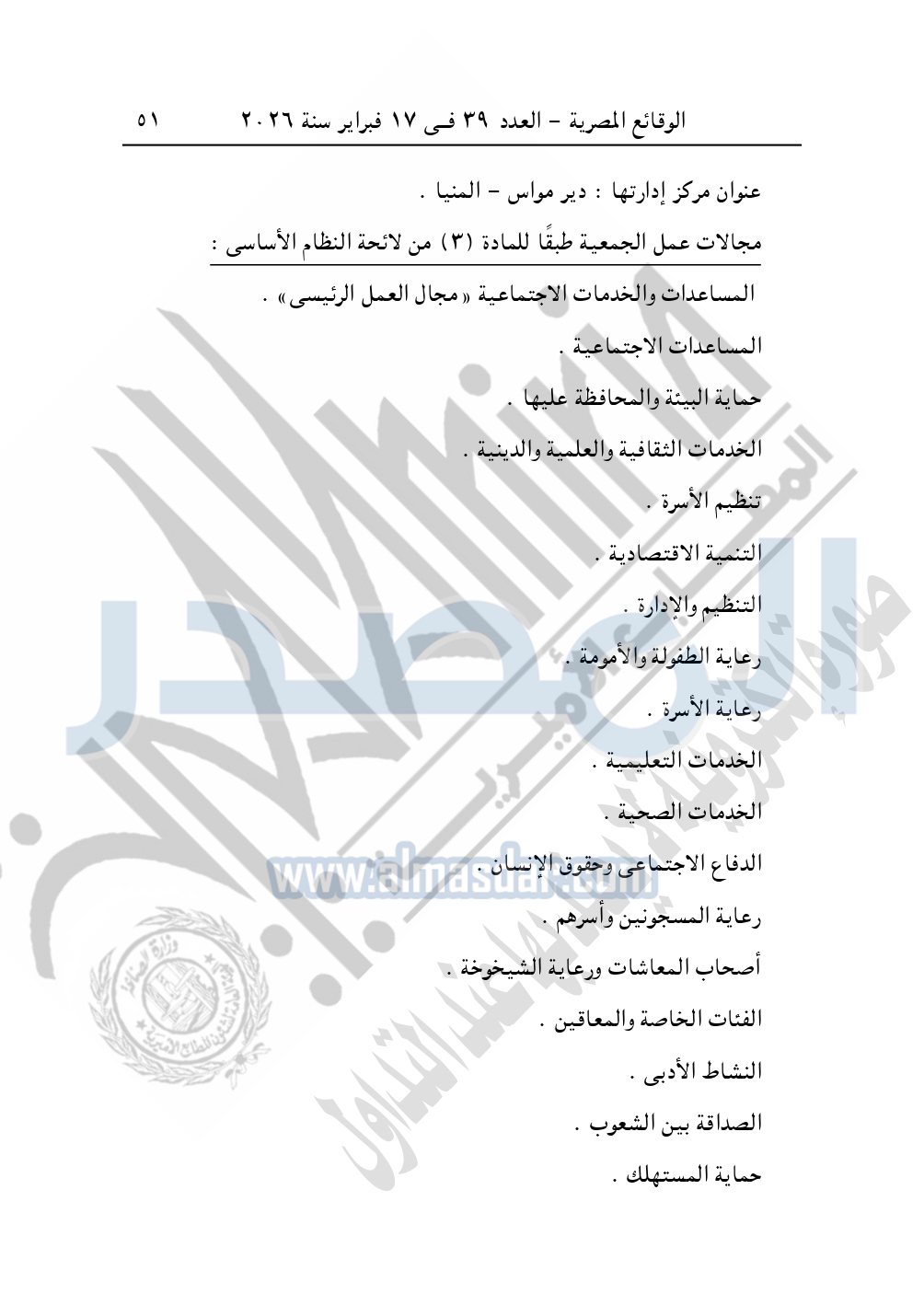 وأيضا نشرت الوقائع المصرية في العدد 39، بتاريخ 17 فبراير 2026، قرار مديرية التضامن الاجتماعي بالمنيا، بشأن توفيق أوضاع جمعية أبواب الخير – دير مواس، المقيدة برقم "2632" لسنة 2012.