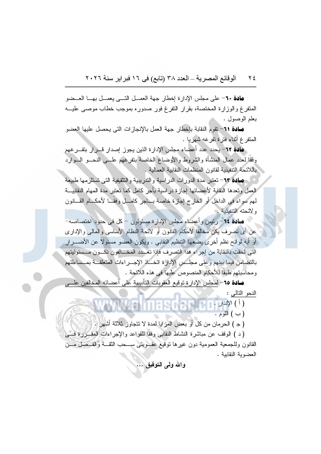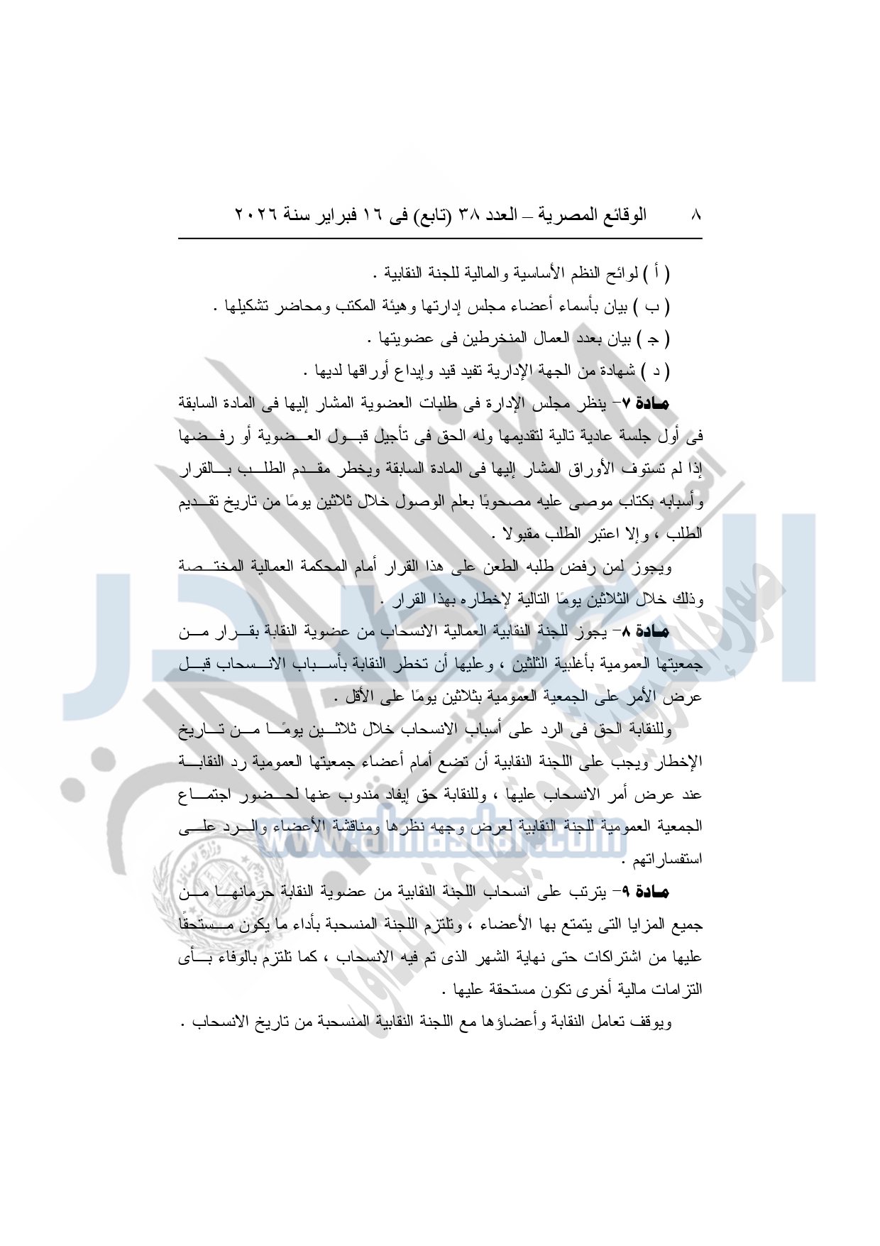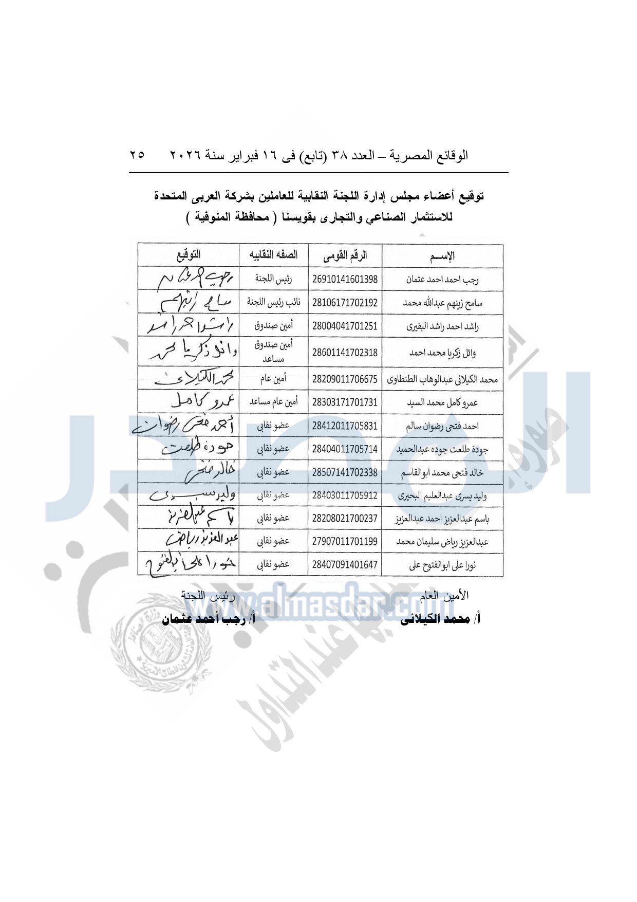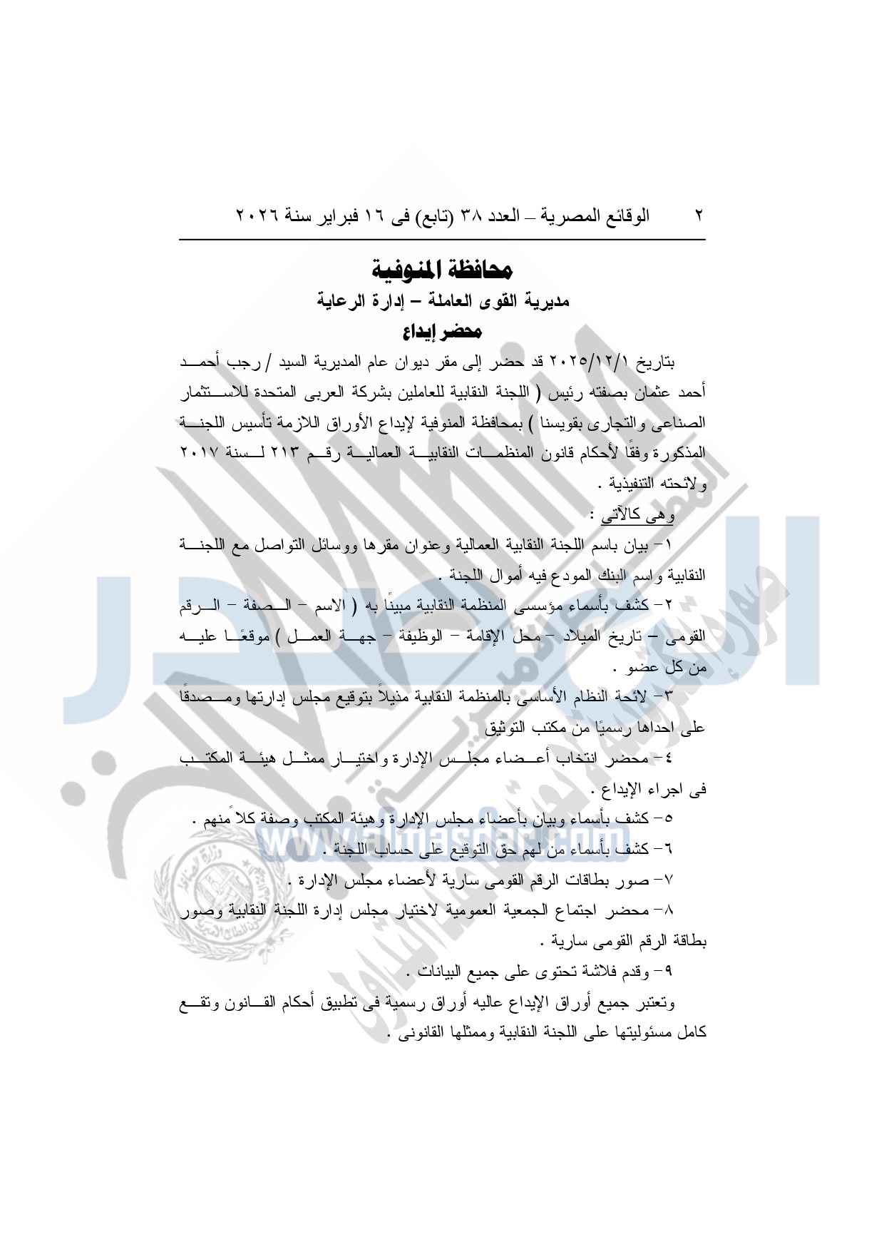 نشرت الوقائع المصرية، في العدد 38 "تابع"، الصادر في 16 فبراير سنة 2026، محافظة المنوفية، مديرية القوى العاملة - إدارة الرعاية، محضر إيداع، بشأن إصدار لائحة اللجنة النقابية بشركة العربي المتحدة للاستثمار الصناعى والتجارى بقويسنا.