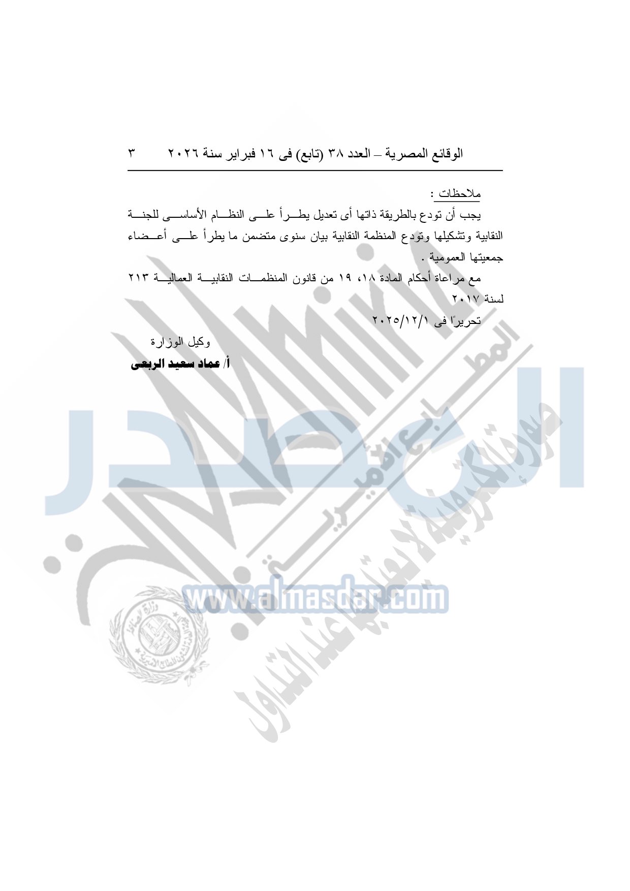 وأوضحت الوقائع المصرية، إنه بتاريخ 1-12-2025 قد حضر إلى مقر ديوان عام المديرية رجب أحمد أحمد عثمان بصفته رئيس "اللجنة النقابية للعاملين بشركة العربي المتحدة للاستثمار الصناعى والتجارى بقويسنا" بمحافظة المنوفية لإيداع الأوراق اللازمة تأسيس اللجنة المذكورة وفقا لأحكام قانون المنظمات النقابية العمالية رقم 213 لسنة 2017 ولائحته التنفيذية.