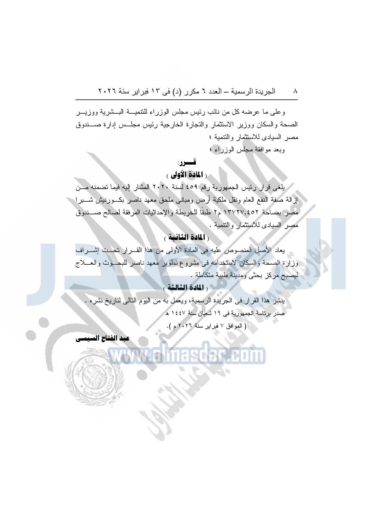 نشرت الجريدة الرسمية، في العدد 6 مكرر "د"، في 13 فبراير سنة 2026، قرار رئيس جمهورية مصر العربية، رقم 68 لسنة 2026، بشأن إعادة تخصيص أراضي ومباني لاستخدامها فى مشروع تطوير معهد ناصر.