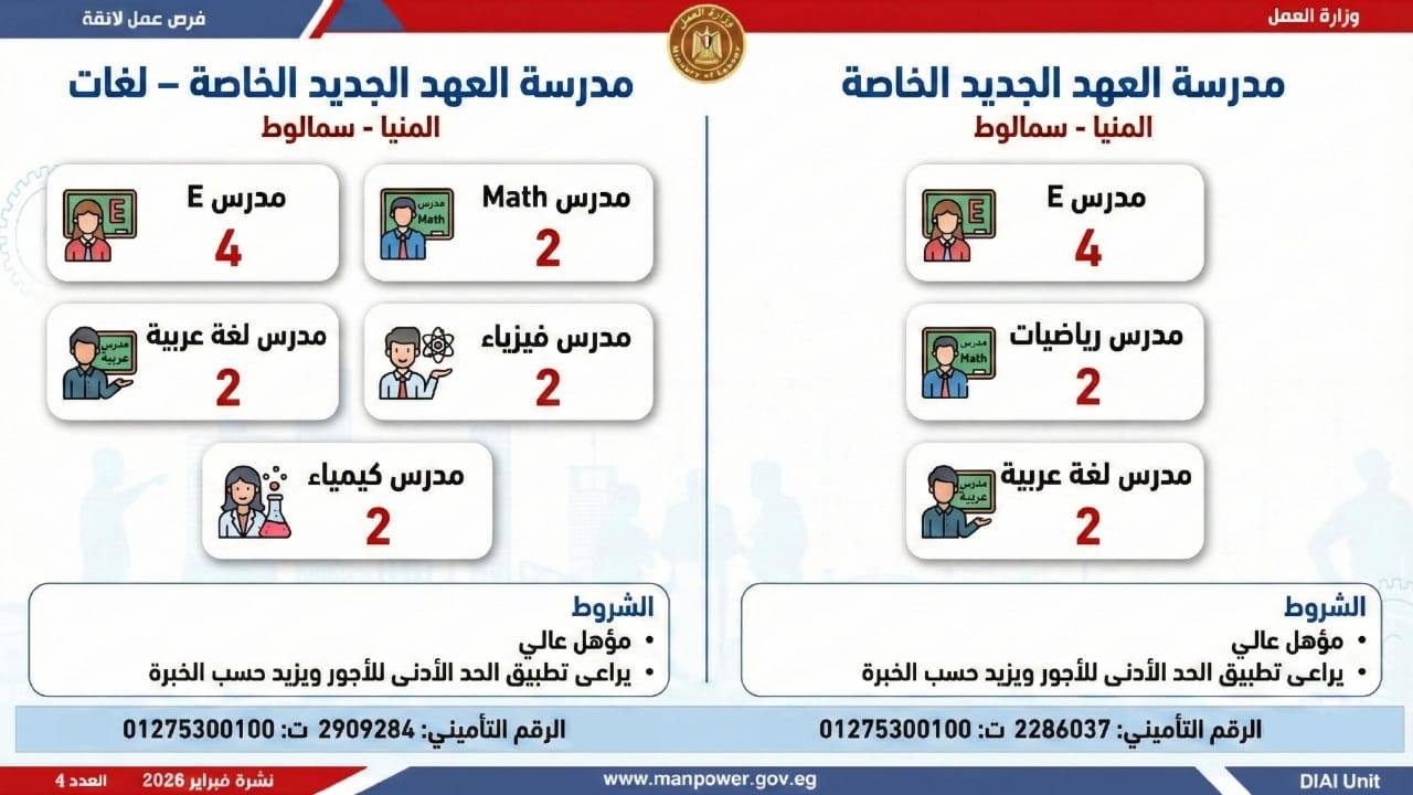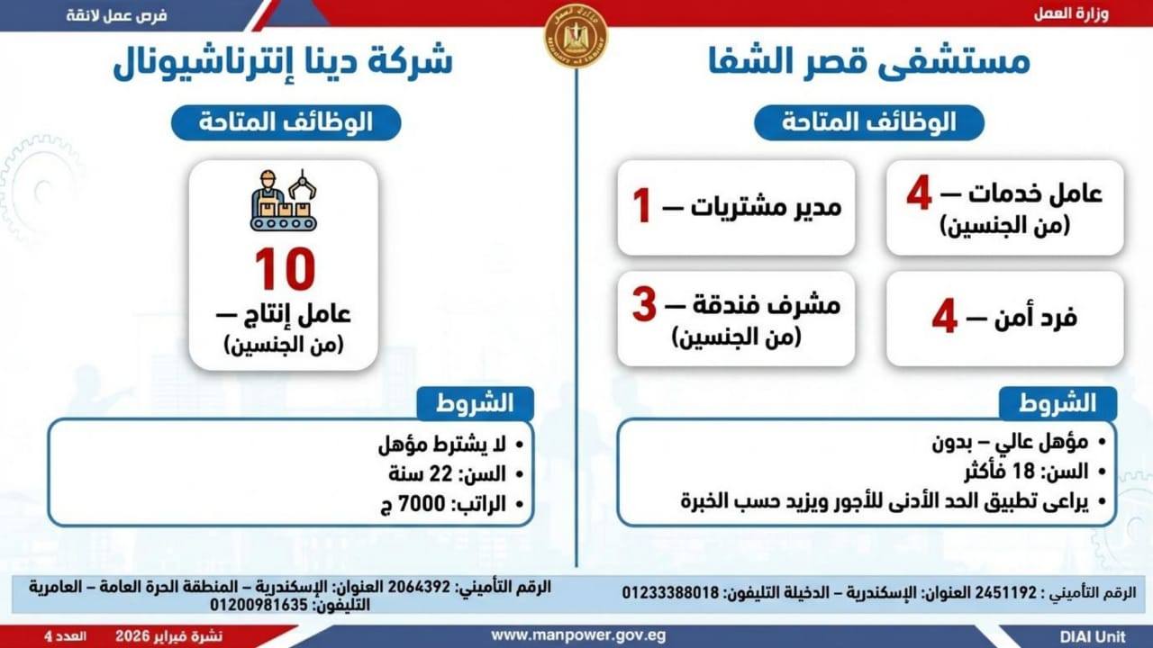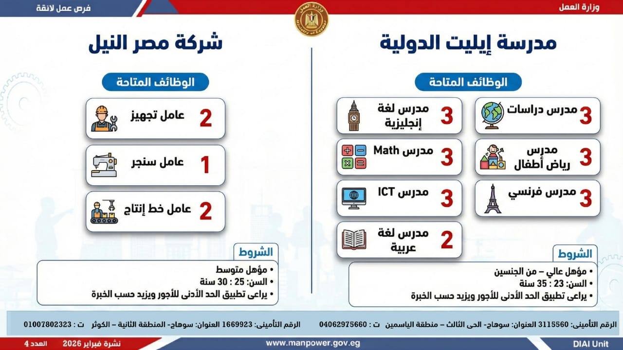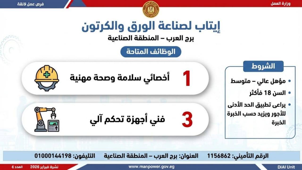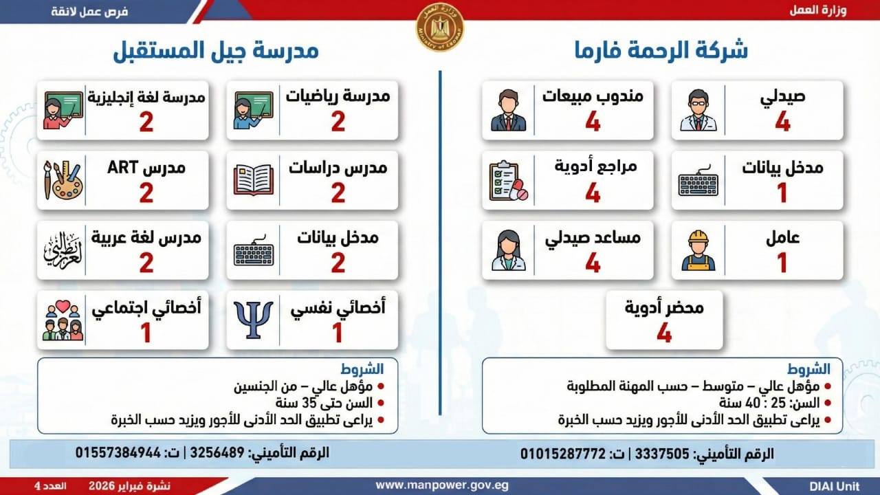 أعلنت وزارة العمل، اليوم السبت، عن إطلاق نشرة التوظيف نصف الشهرية الجديدة، التي تتضمن 5456 فرصة عمل جديدة، بالتعاون مع 54 شركة من شركات القطاع الخاص، موزعة على 14 محافظة، مع فتح باب التقديم خلال شهري فبراير ومارس 2026، في خطوة تحمل رسالة واضحة: العمل حق، والفرصة مسؤولية، والبطالة معركة تخوضها الدولة بالفعل لا بالكلام.